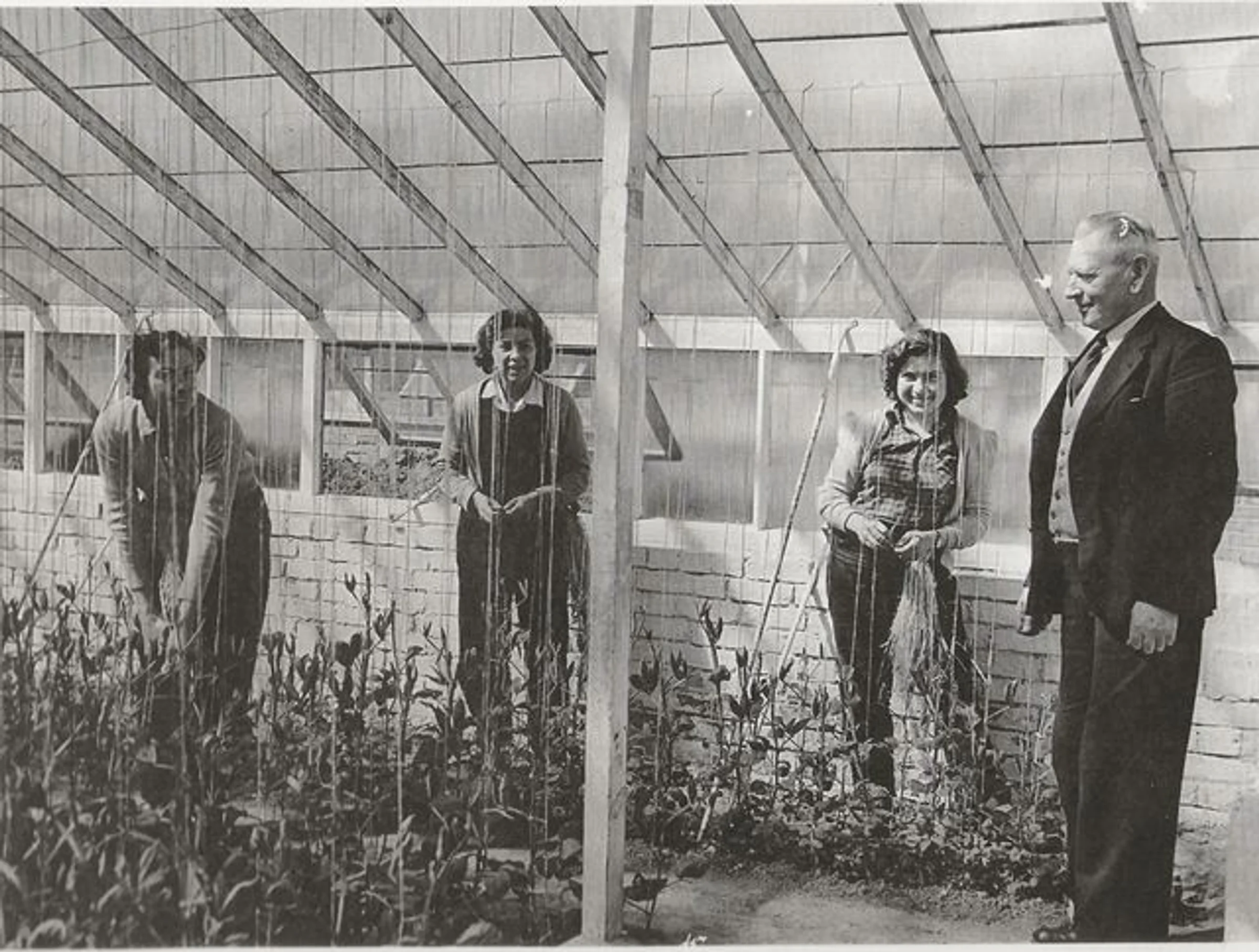This is a photo reprinted in Nurseryman and Seedgrower in May 1956. David Fenwick of Bypass Nurseries was about to purchase Dobbies. In the magazine the photo is labelled as 'J Gray and some of his staff discussing sweet peas with John Fife and David Fenwick' (who were standing on the right).