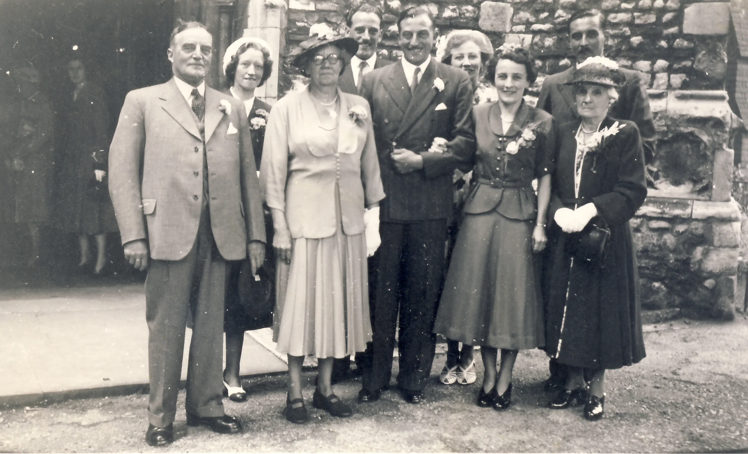 Balck and white photograph from Des Norfolk's first wedding. Nine people, five women and four men, pose for the camera, though two more are visible in the darkened doorway of the church.
