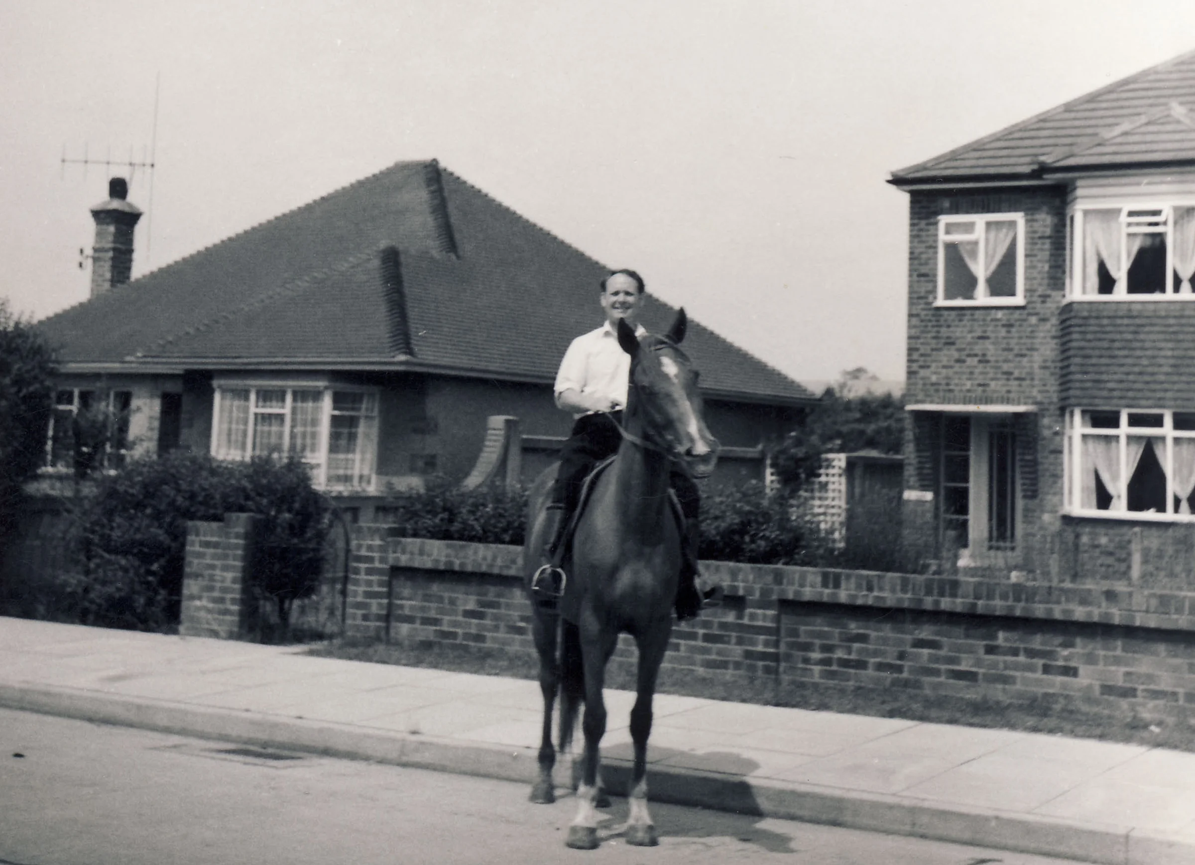 Black and white photograph of a member of Roger Browning-Smith family on horseback. He wears riding boots, dark trousers and a white shirt, the horse has a dark coat with a white diamond on the forehead and white socks. They pose on a street, in front of two houses, location unknown.