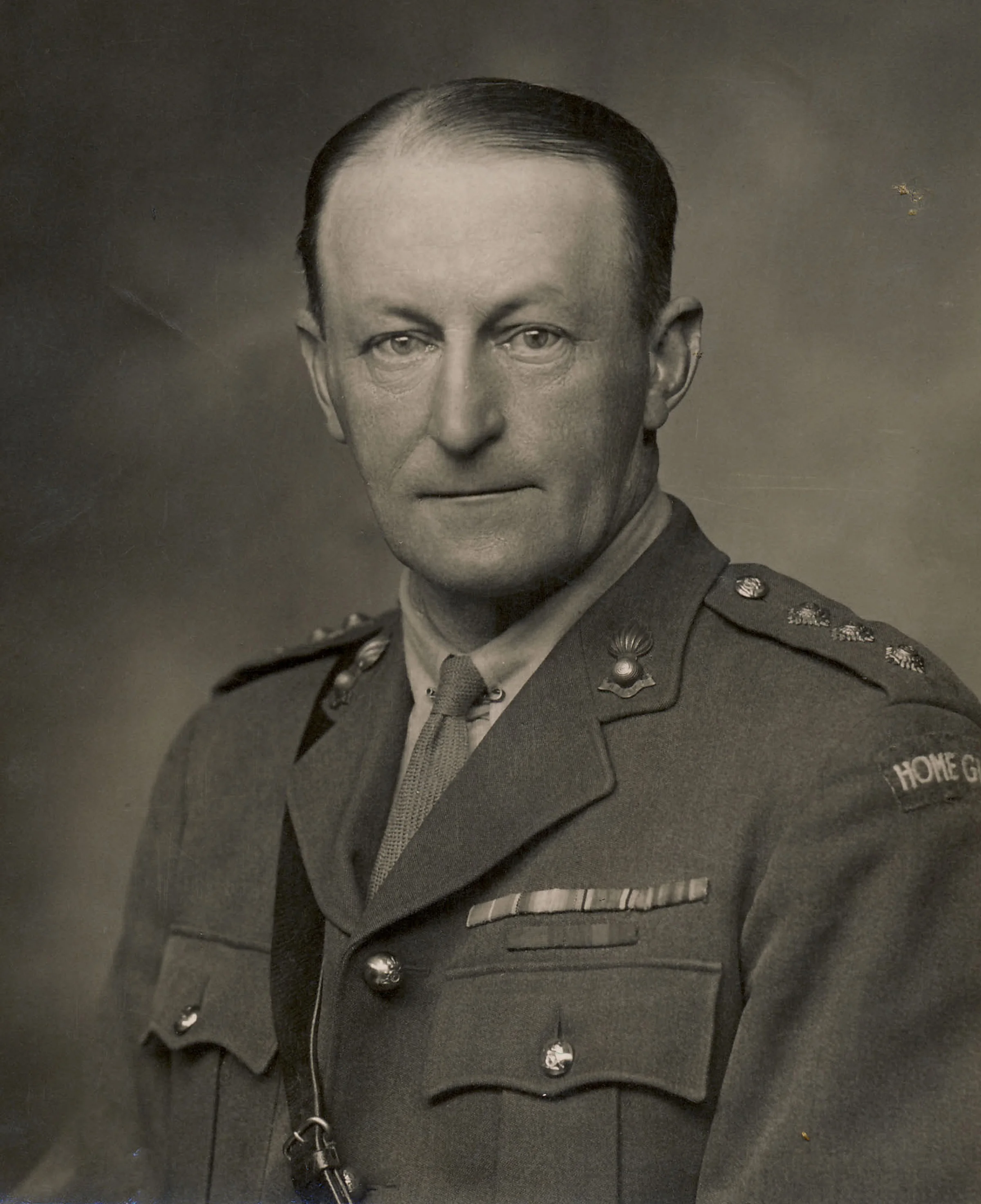 A black and white photograph of Roger Browning-Smith Family in Home Guard uniform. Believed to be Marks Tey Home Guard.