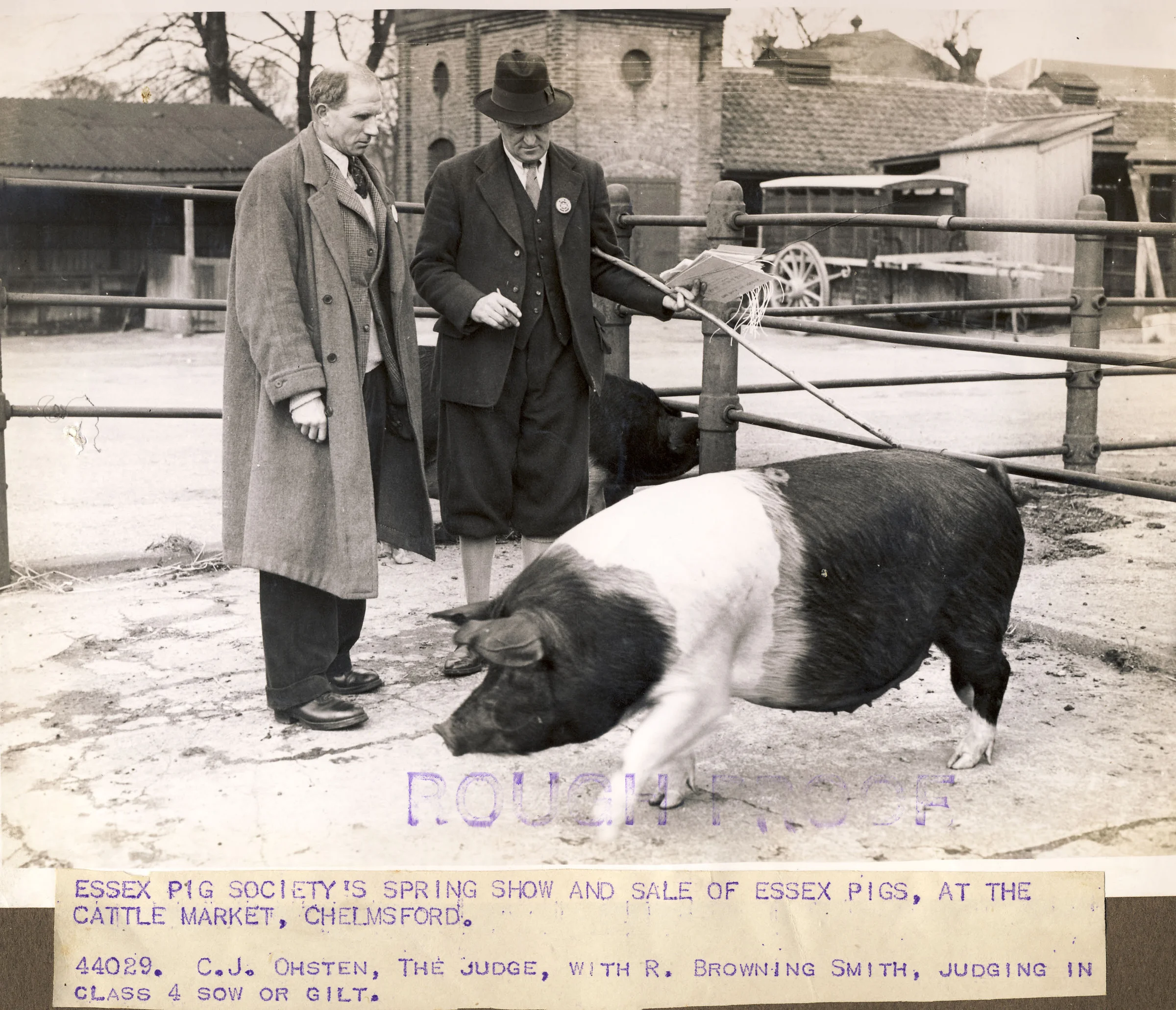 Black and white photograph of two men, one in a long coat, the other in short coat and hat, judging a spotted pig. The hatted man holds a stick, whcih he uses to gesture to the pig's hind legs. The photograph is labelled 'Essex pig society's spring show and sale of Essex pigs, at the cattle market, Chelmsford. 44029. C.J. Ohsten, the judge, with R. Browning-Smith, judging in the class 4 sow or gilt.'