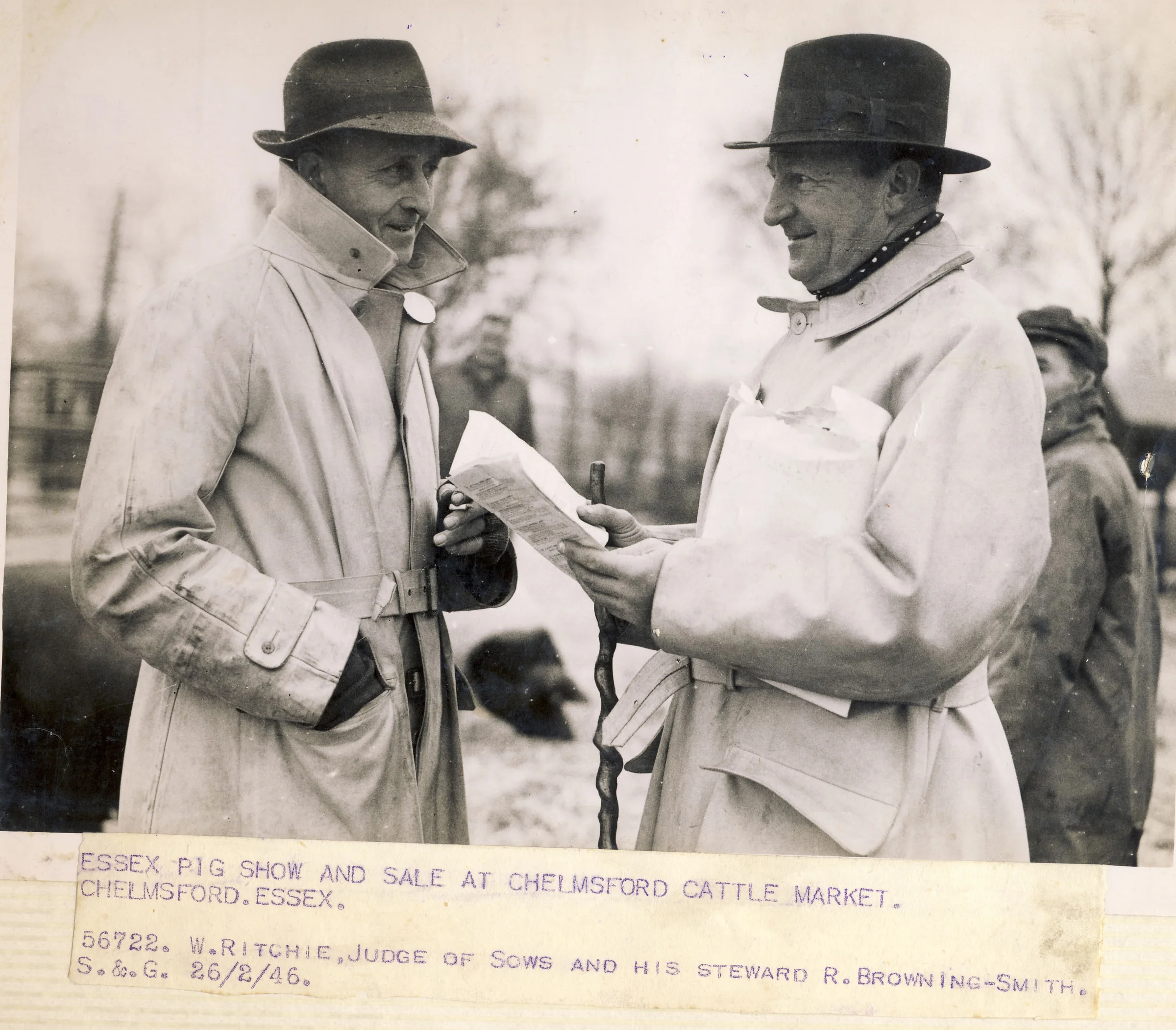 A black and white photgraph of two men in high-collared coats and hats, one holding a twisting wooden stick and booklet, the other a cigarette. It is labelled 'Essex pig show and sale at Chelmsford Cattle Market. Chelmsford. Essex. 56722. W. Ritchie, judge of sows and his steward R. Browning-Smith. S.&.G.26/2/46.'