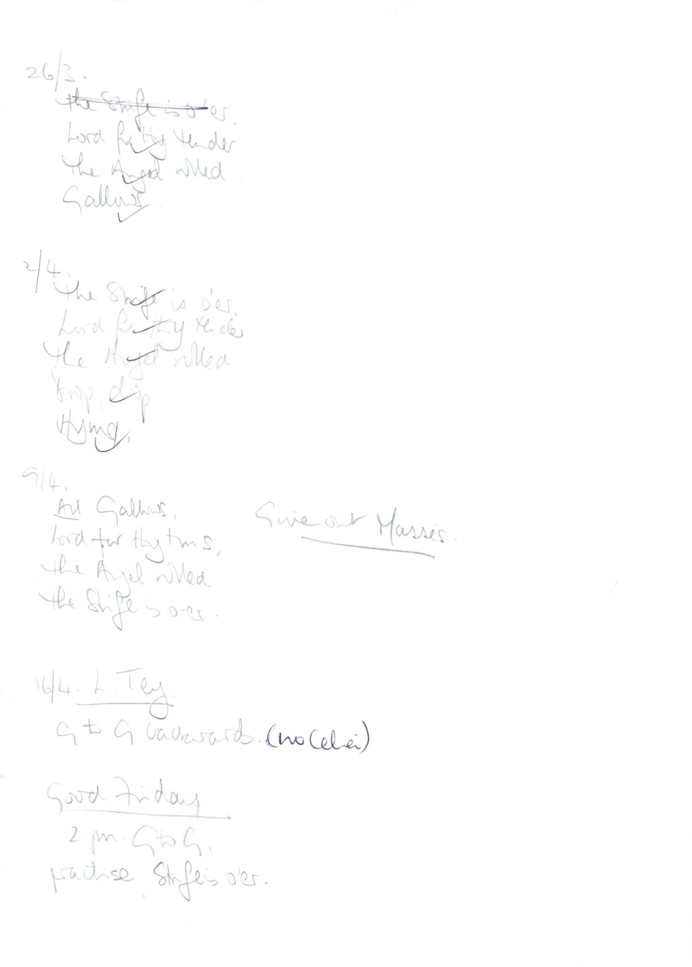 Rosemary Graves' plans for The Tey Singers to practise singing for Holy Week, including a performance of 'Gallows to Glory on Good Friday at Little Tey church.