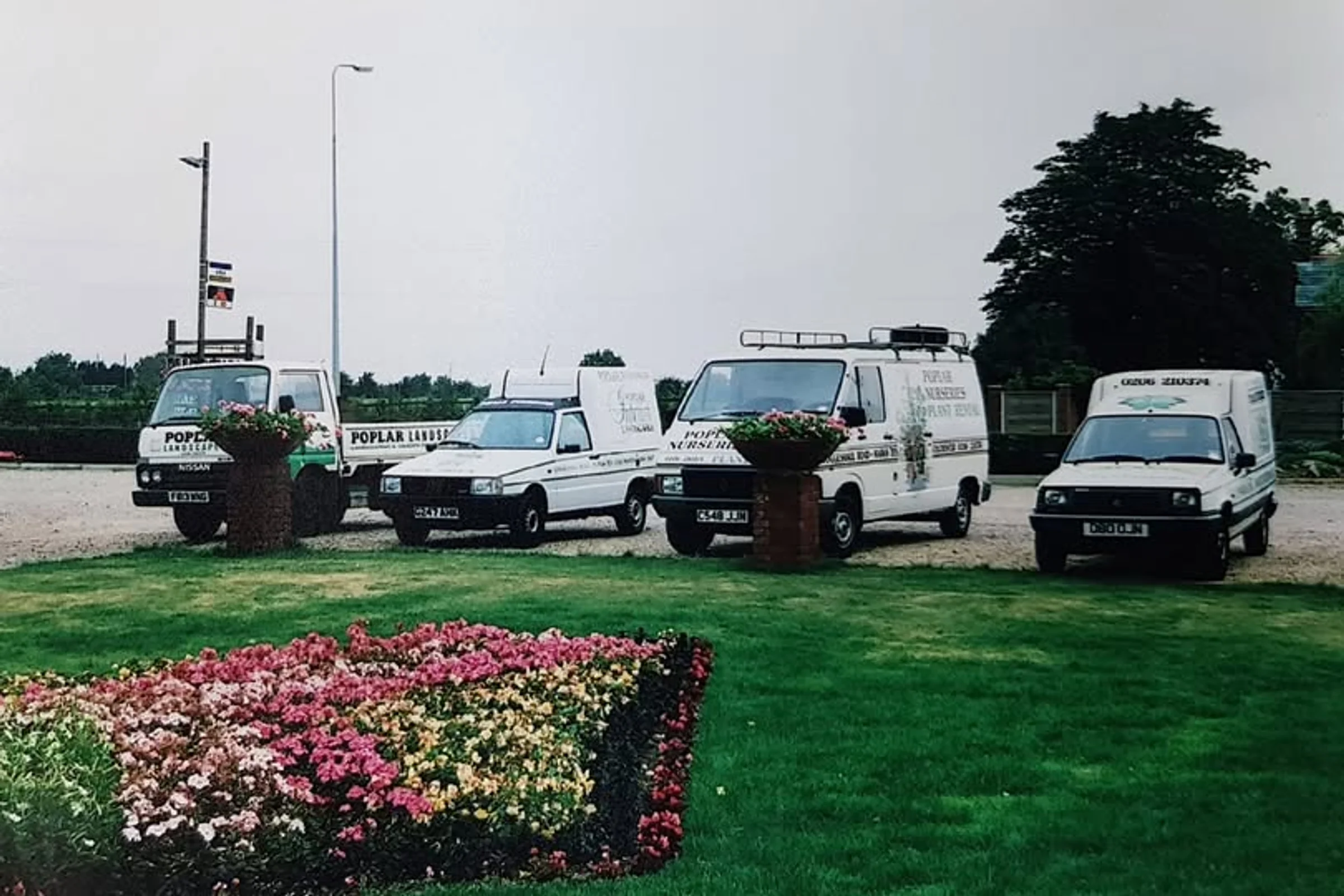 A photo from the early 1990s posted at Facebook on the Poplar Nurseries page showing delivery vans parked on the forecourt.
