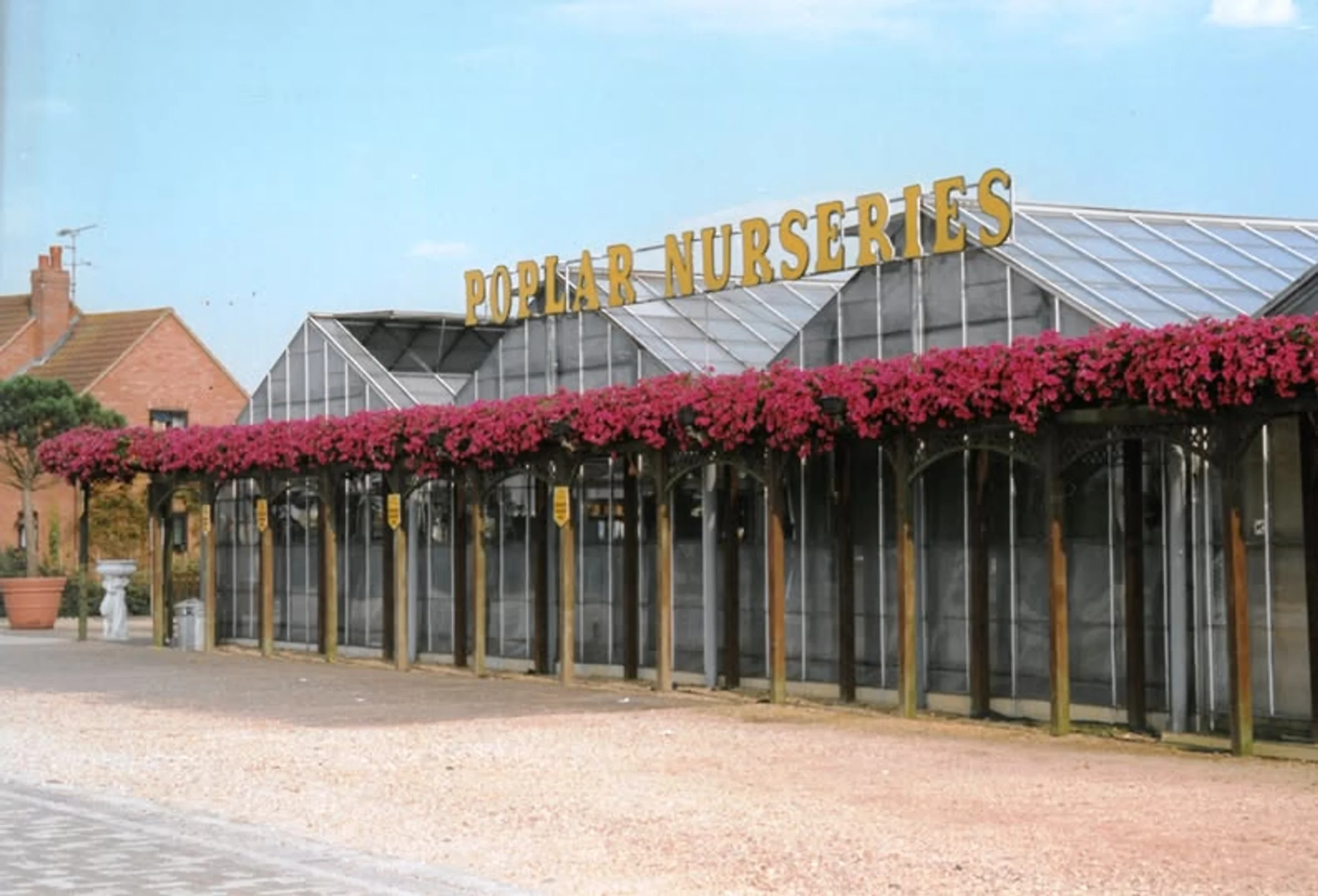 Undated photo posted at Facebook on the Poplar Nurseries page showing the front of Poplar Nurseries. It was summertime with the floral hanging decorations on the building.