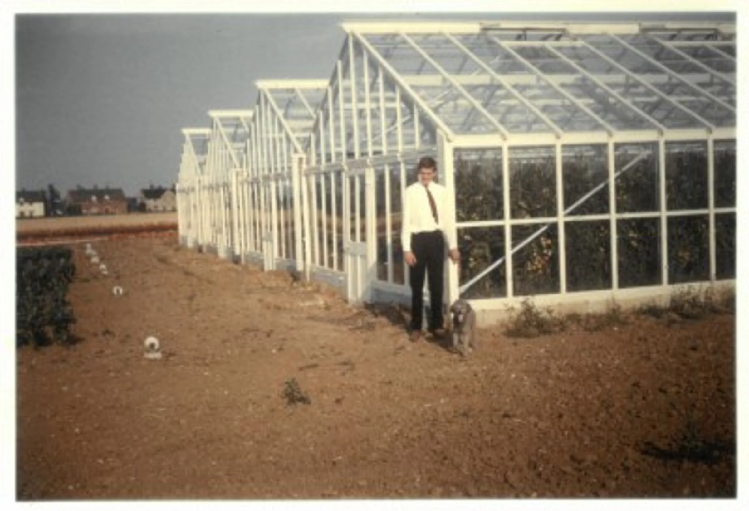 Undated photo posted at Facebook on the Poplar Nurseries page showing Martin Cowan standing in front of a greenhouse. The comment said he grew AYR Chrysanthemums meaning 'All the Year Round'.