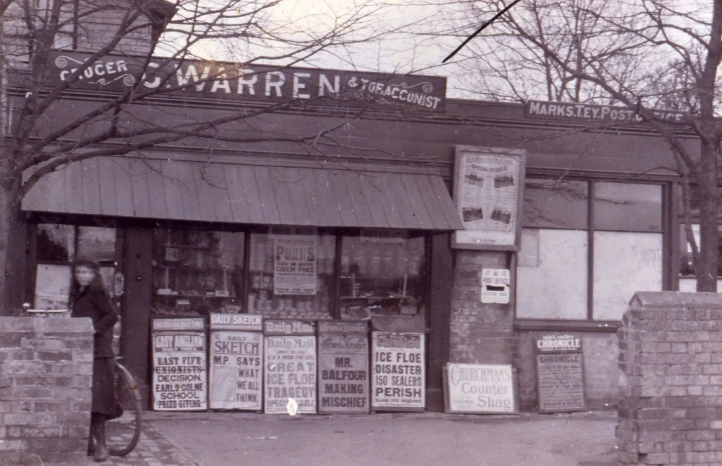 A view of G Warren's Post Office and grocery business. The advertisements outside the shop include the Daily Sketch newspaper which began in 1909, The ice floe tragedy in the news is likely to refer to a storm affecting Newfoundland sealers in 1914.