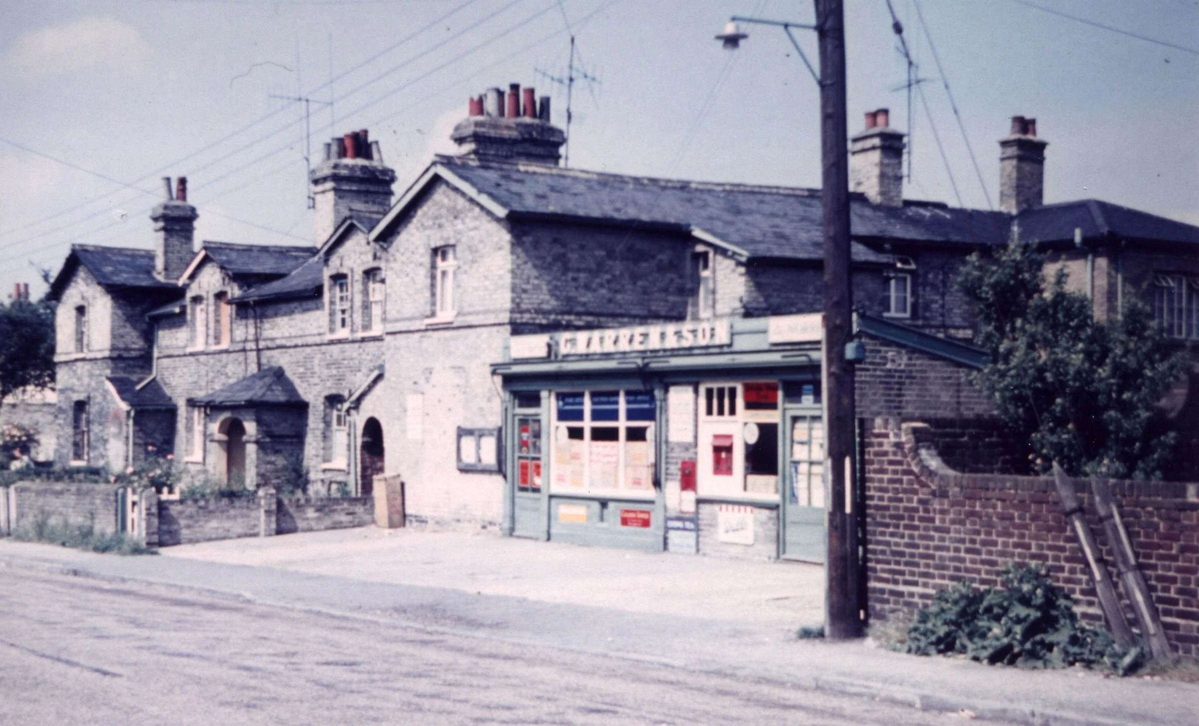 A colour or coloured photo of the Post Office and grocery shop in Station Road. The big tree on earlier images has gone. The shop is clearly called G Warren & Son.