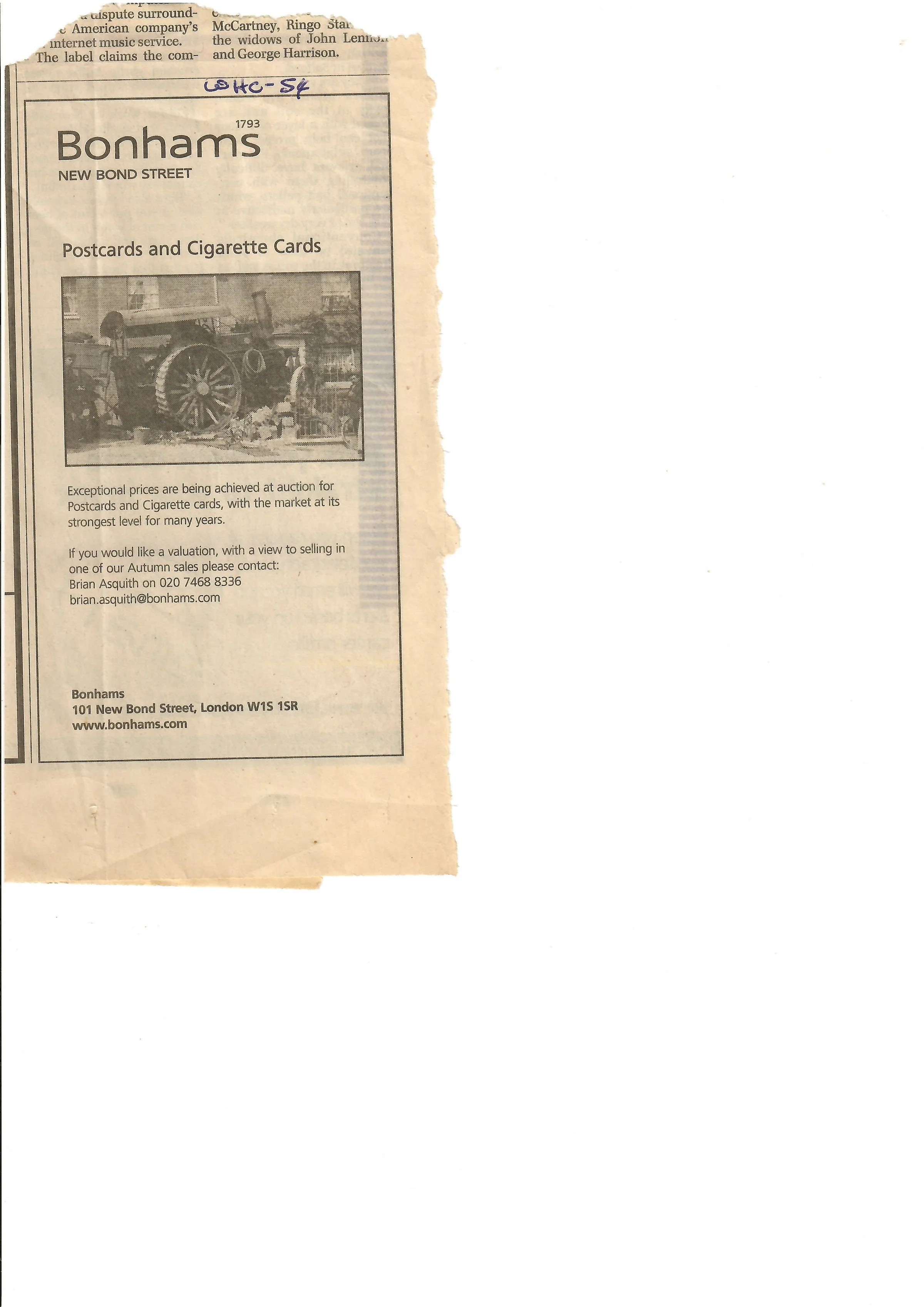 An advert from Bonham's selling postcard's of the Balkerne Hill crash, 1907.