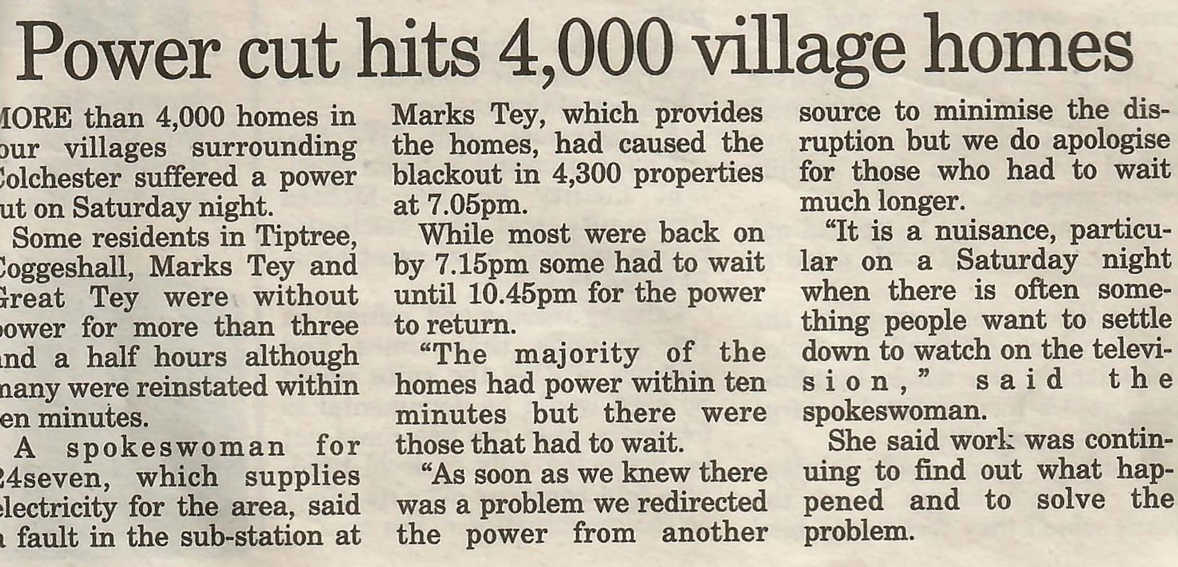 Newspaper report regarding a power cut affecting 4,000 homes.