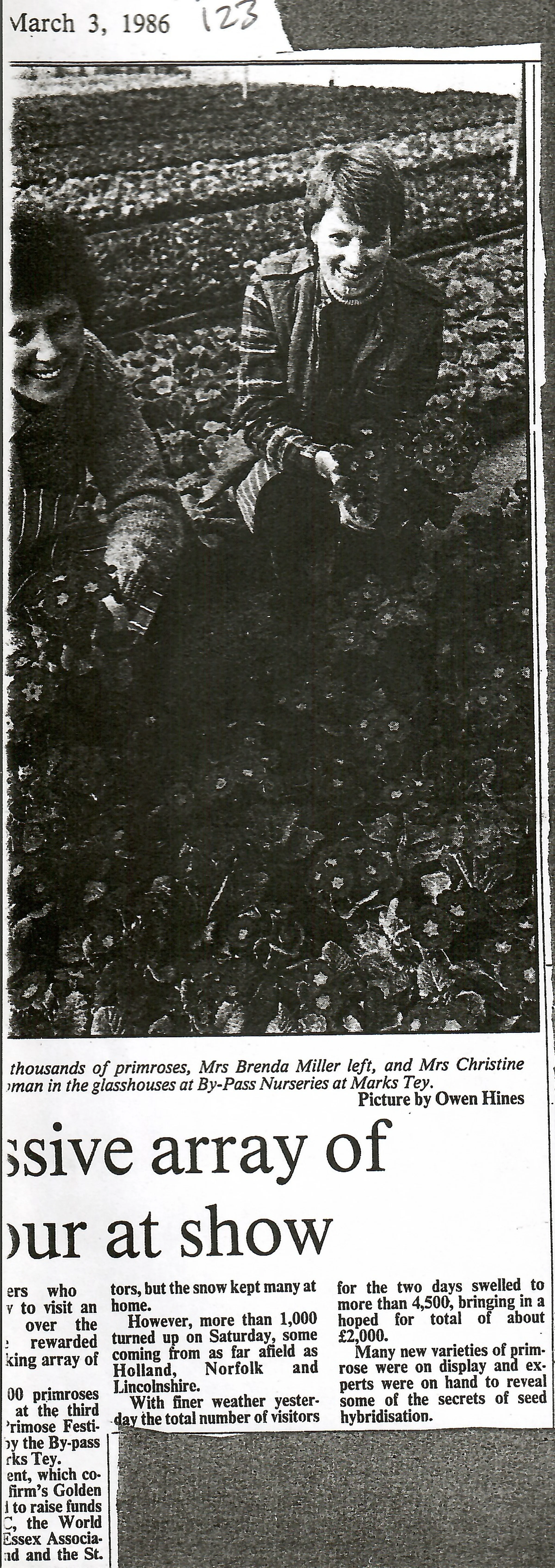 Part of this cutting is missing but the title must say 'Massive array of colour'. The photo shows two members of staff with the flowers at By-pass Nurseries. One is Brenda Miller and the other is named Christine.