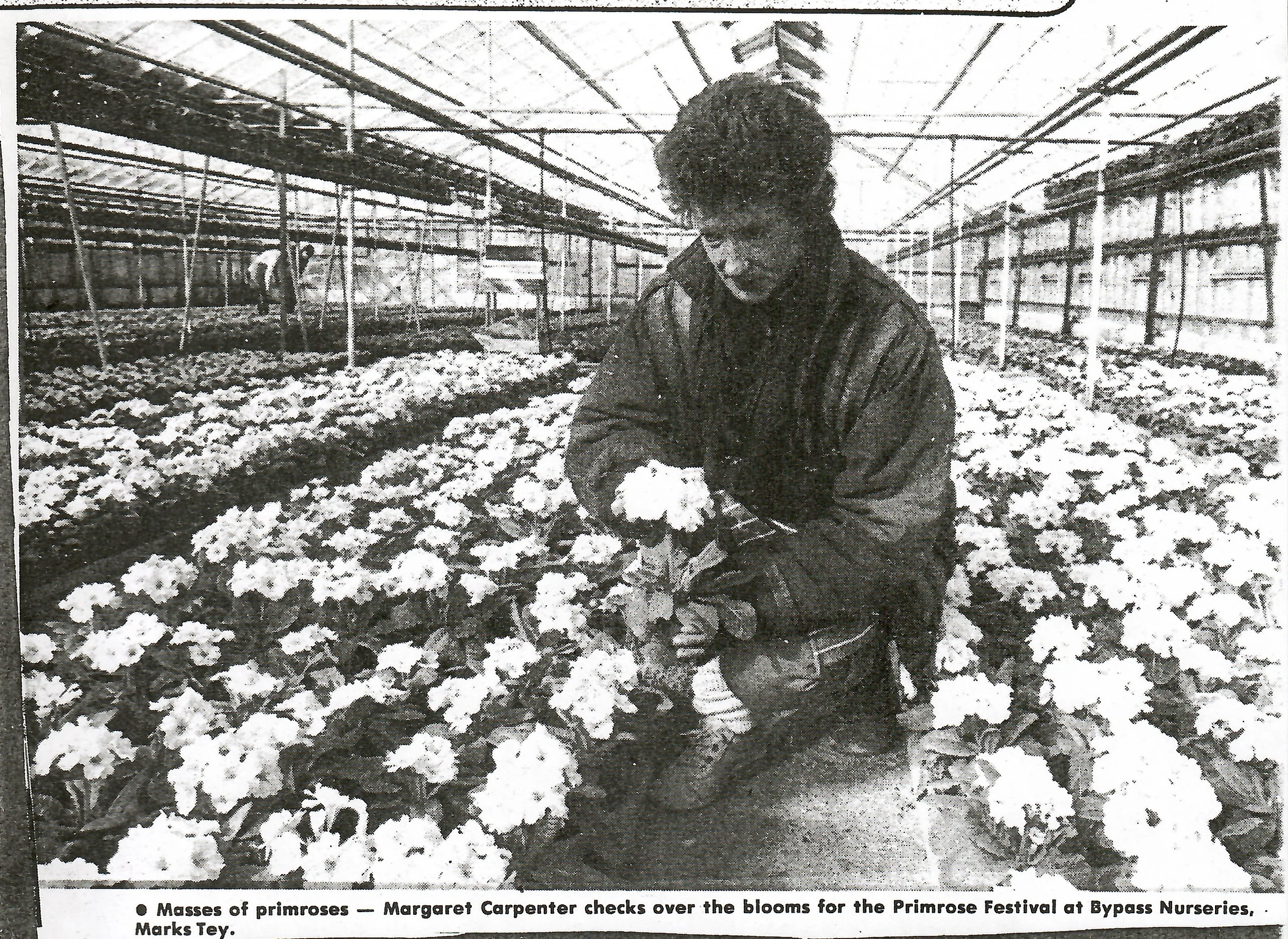 Margaret Carpenter at work checking the primroses at Bypass Nurseries.