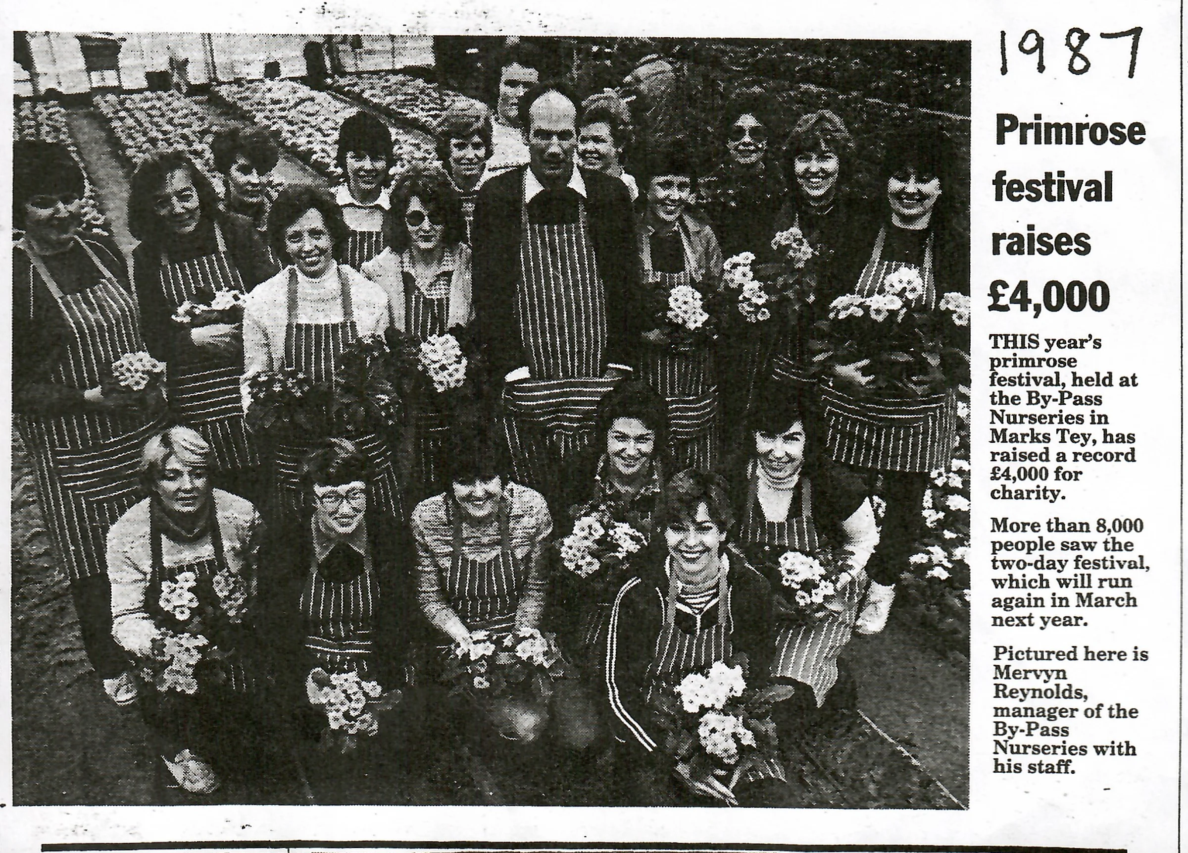About twenty female members of staff around their manager Mervyn Reynolds at Bypass Nurseries at the time of the Primrose Festival.