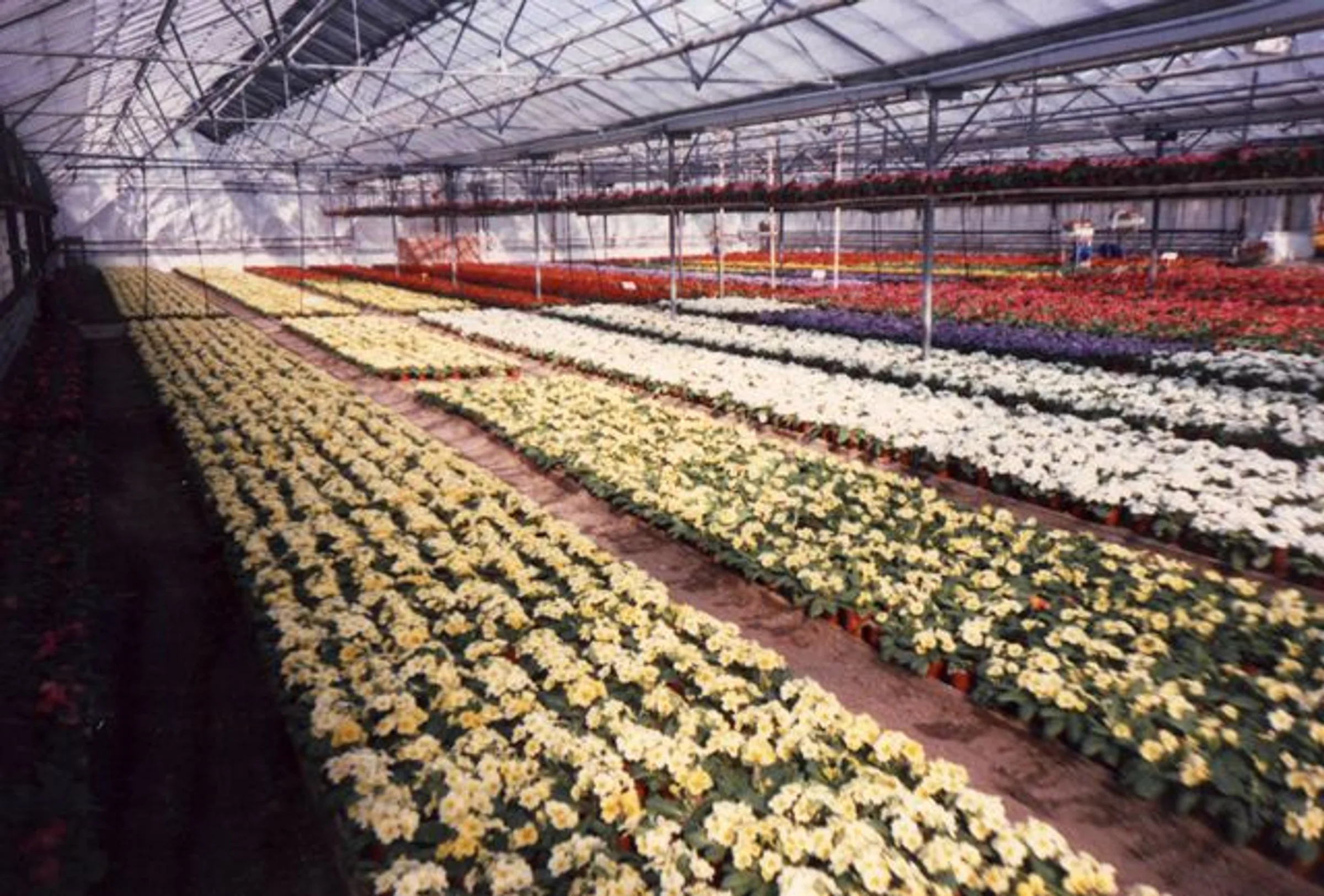 Undated photo of a greenhouse full of primroses flowering, in yellow, white and red rows.