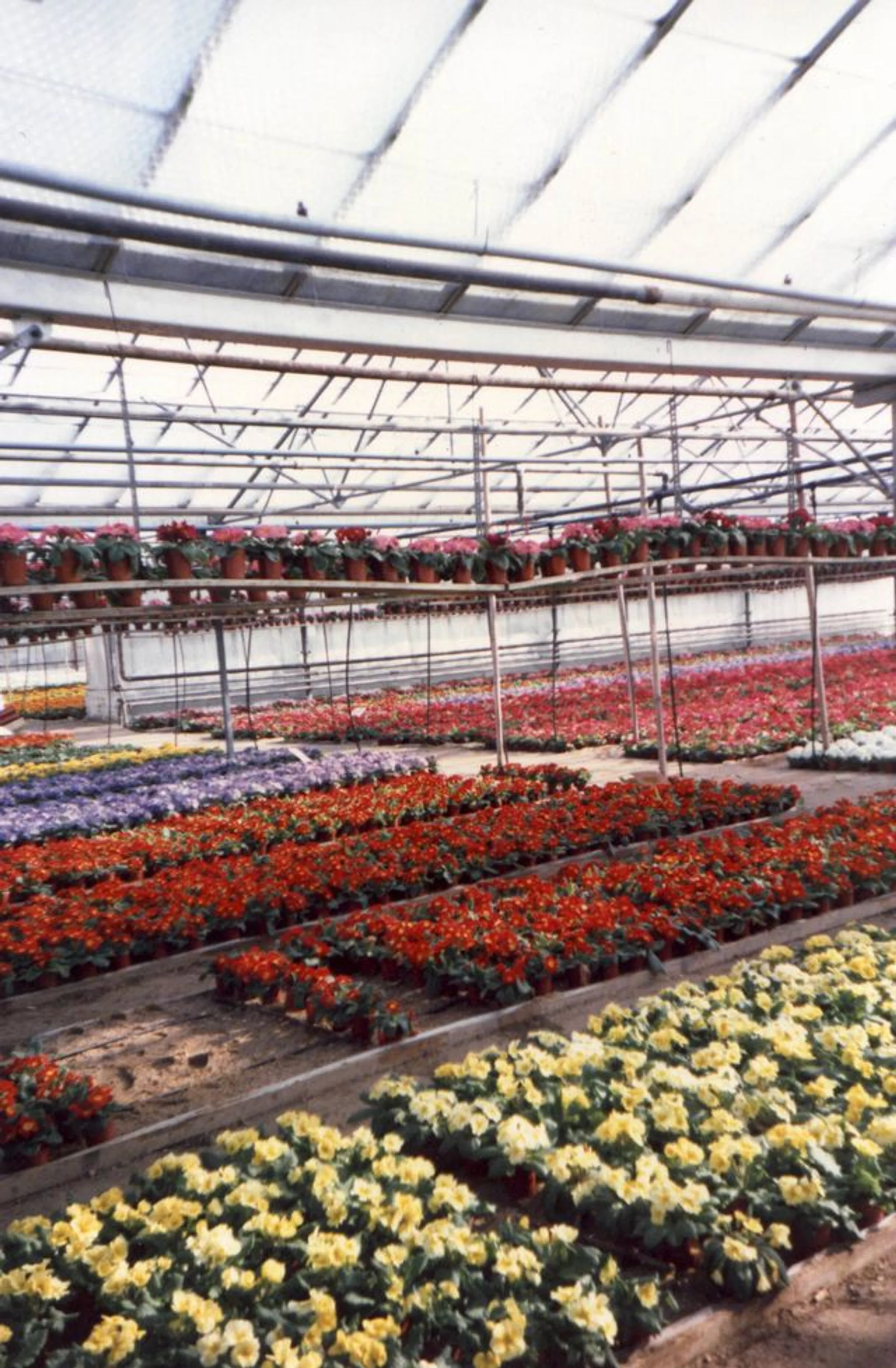 A greenhouse at Bypass Nurseries full of red and yellow flowers, probably primroses.