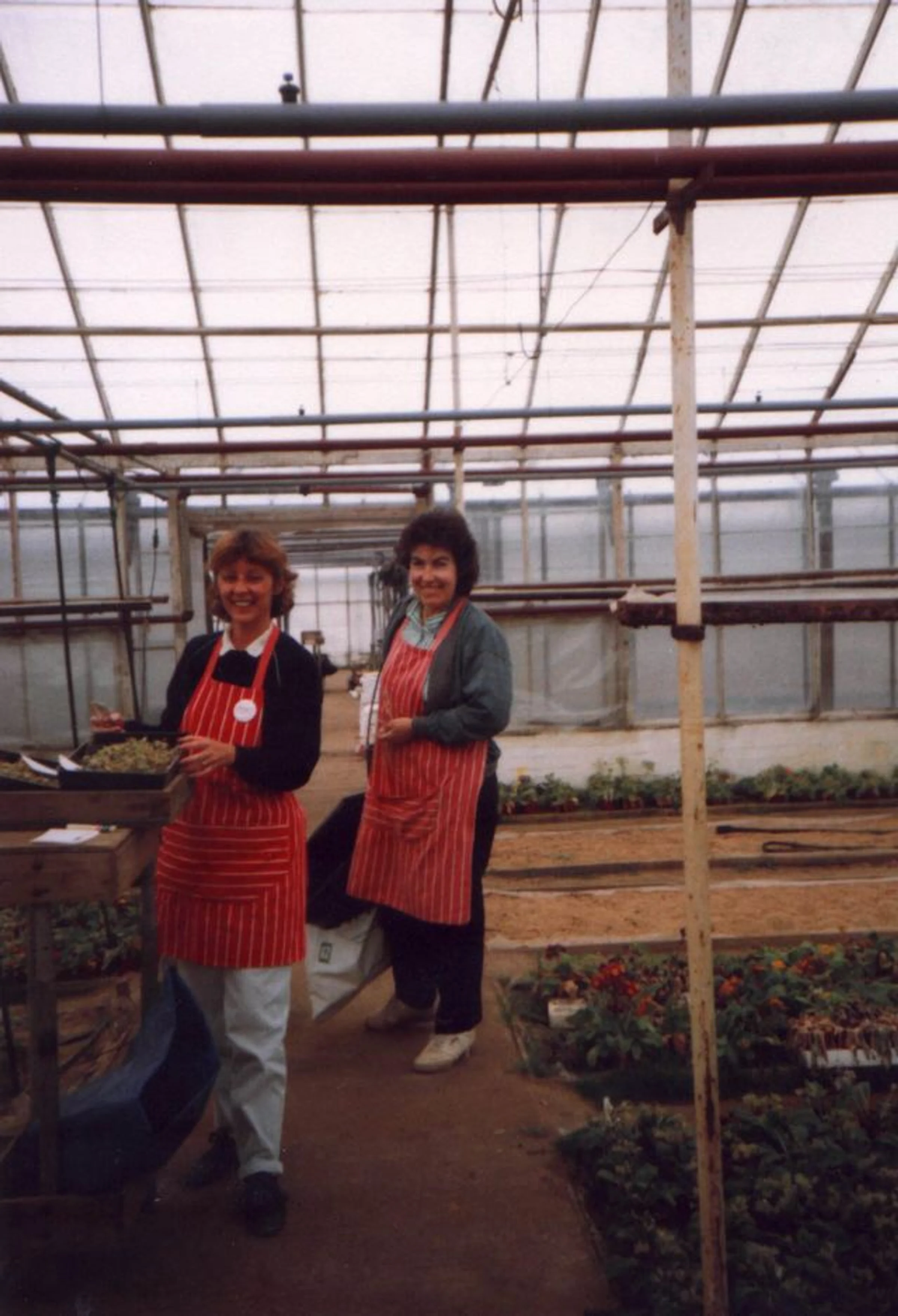Two members of Bypass Nurseries staff wearing their aprons during a Primrose Festival.