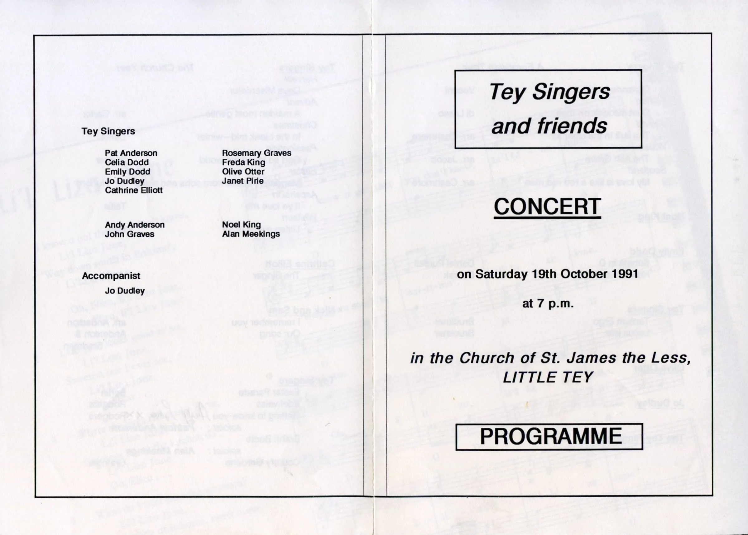 The programme for a concert given by The Tey Singers held in the church of St James the Less, Little Tey on Saturday, 19 October 1987. Those singing in the choir were Pat Anderson, Celia Dodd, Emily Dodd, Jo Dudley, Cathrine Elliott, Rosemary Graves, Freda King, Olive Otter, Janet Pirie, Andy Anderson, John Graves, Noel King and Alan Meekings. Other performers were The Tey Ringers, Nick Anderson and Sam. The accompanist was Jo Dudley.