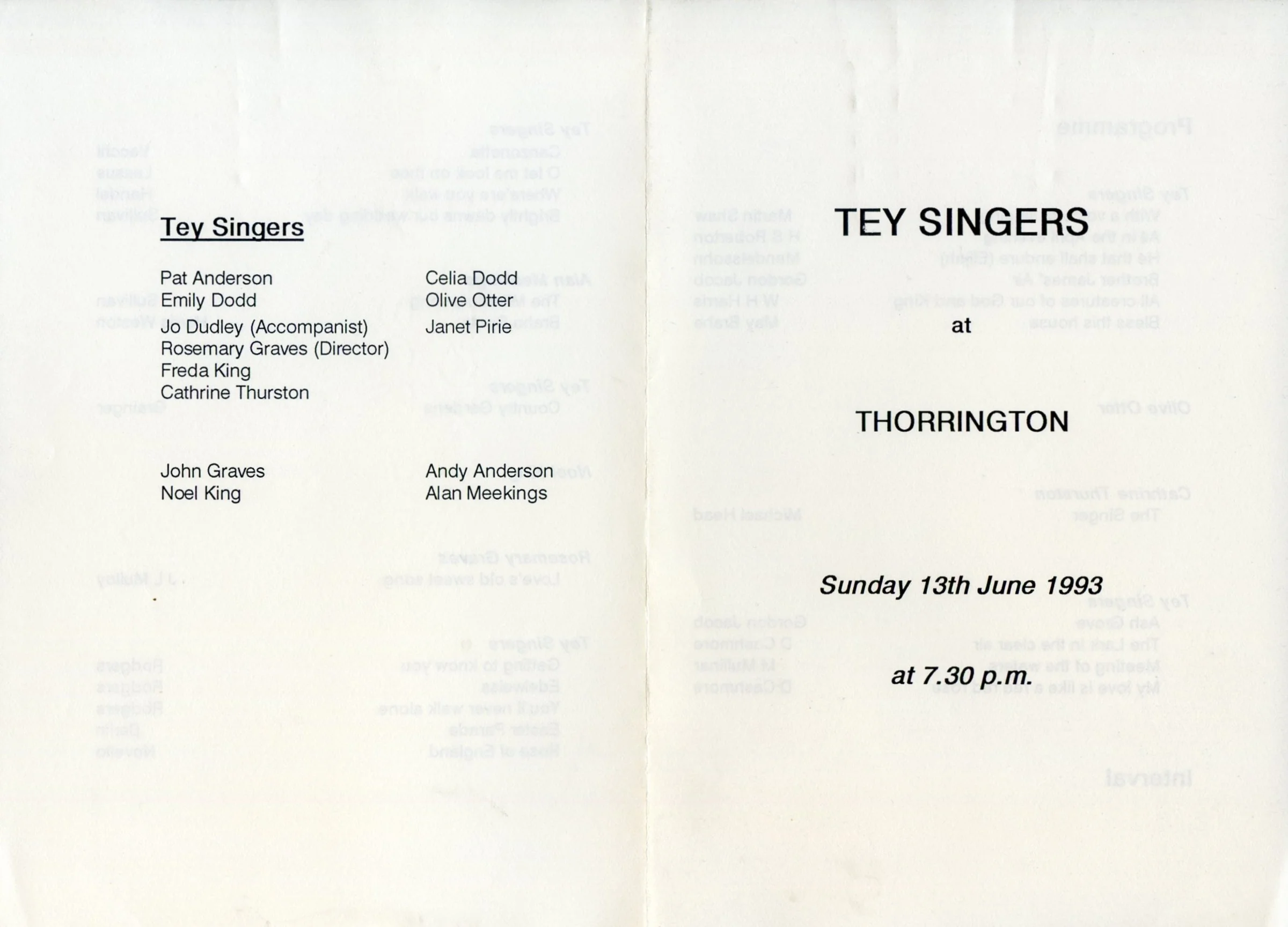 The programme for a concert given by The Tey Singers held in the church of Thorrington on Sunday, 13 June 1993. Those singing in the choir were Pat Anderson, Emily Dodd, Rosemary Graves (Director), Freda King, Cathrine Elliott, Celia Dodd, Olive Otter, Janet Pirie, John Graves, Noel King, Andy Anderson, and Alan Meekings. The accompanist was Jo Dudley.