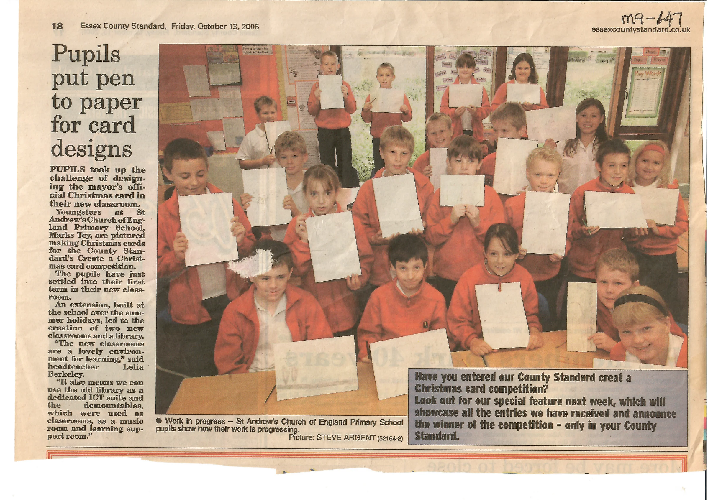 Newspaper clipping titled ‘Pupils put pen to paper for card designs” with a group photograph of pupils from St Andrews Primary School showcasing their card designs.