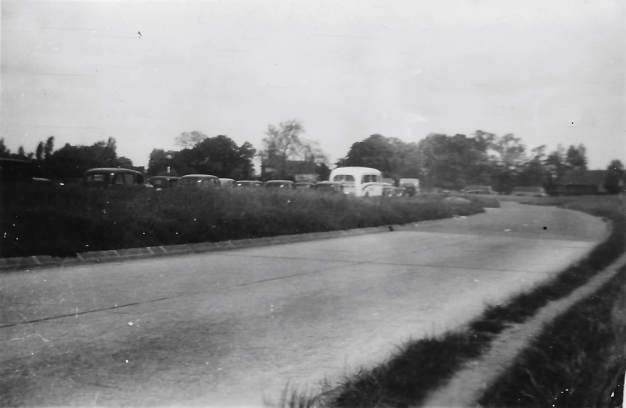 Queuing cars and coaches in one direction of the A12 dual carriageway in 1950 looking towards the old church hall on the right behind a roundabout. Note the bolisha beacon on the left where there must have been a crossing. The building just to the left of the white coach might be what is now Old Rectory Court.