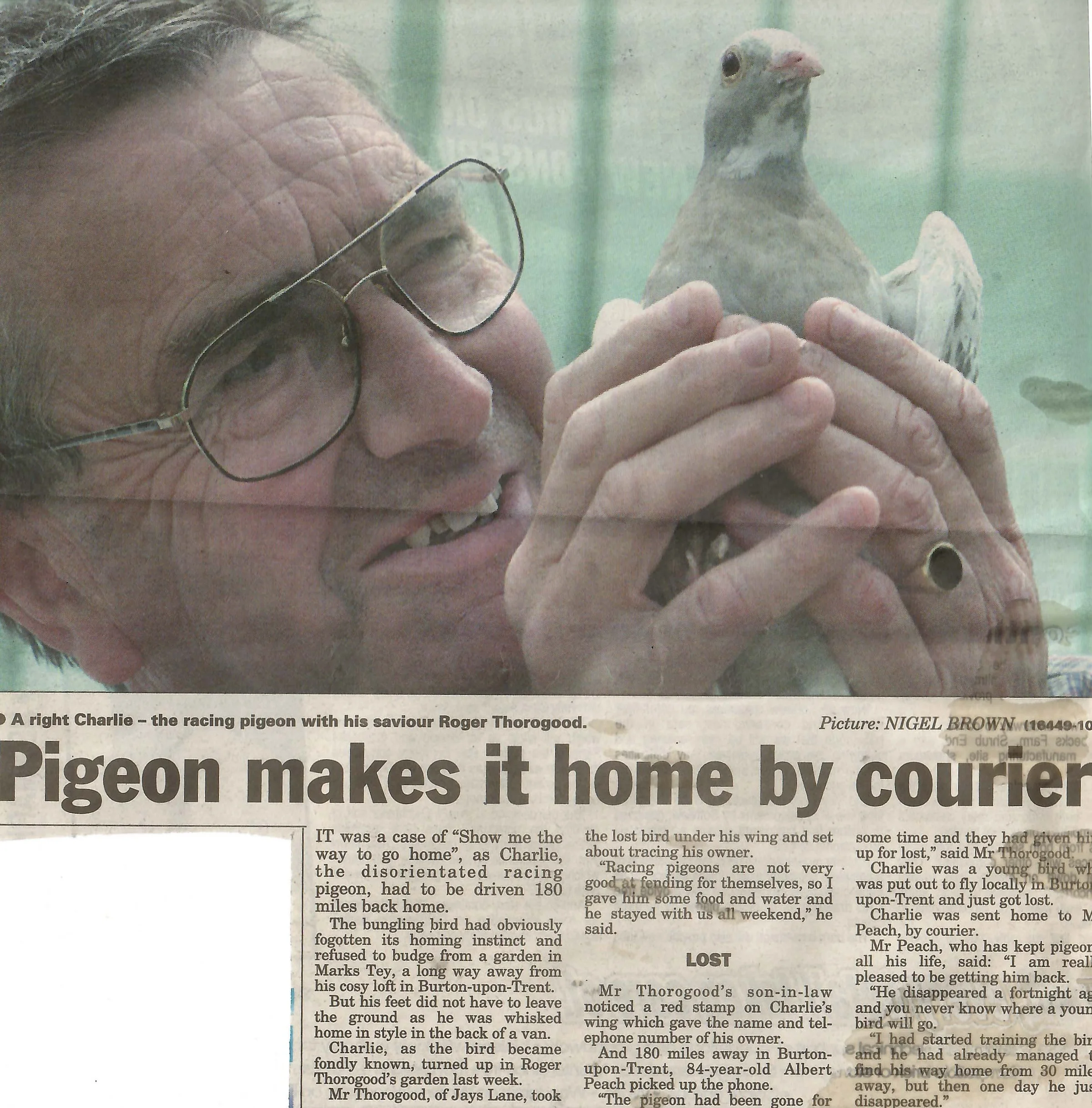 Newspaper photograph and report regarding a racing pigeon off course in Marks Tey.