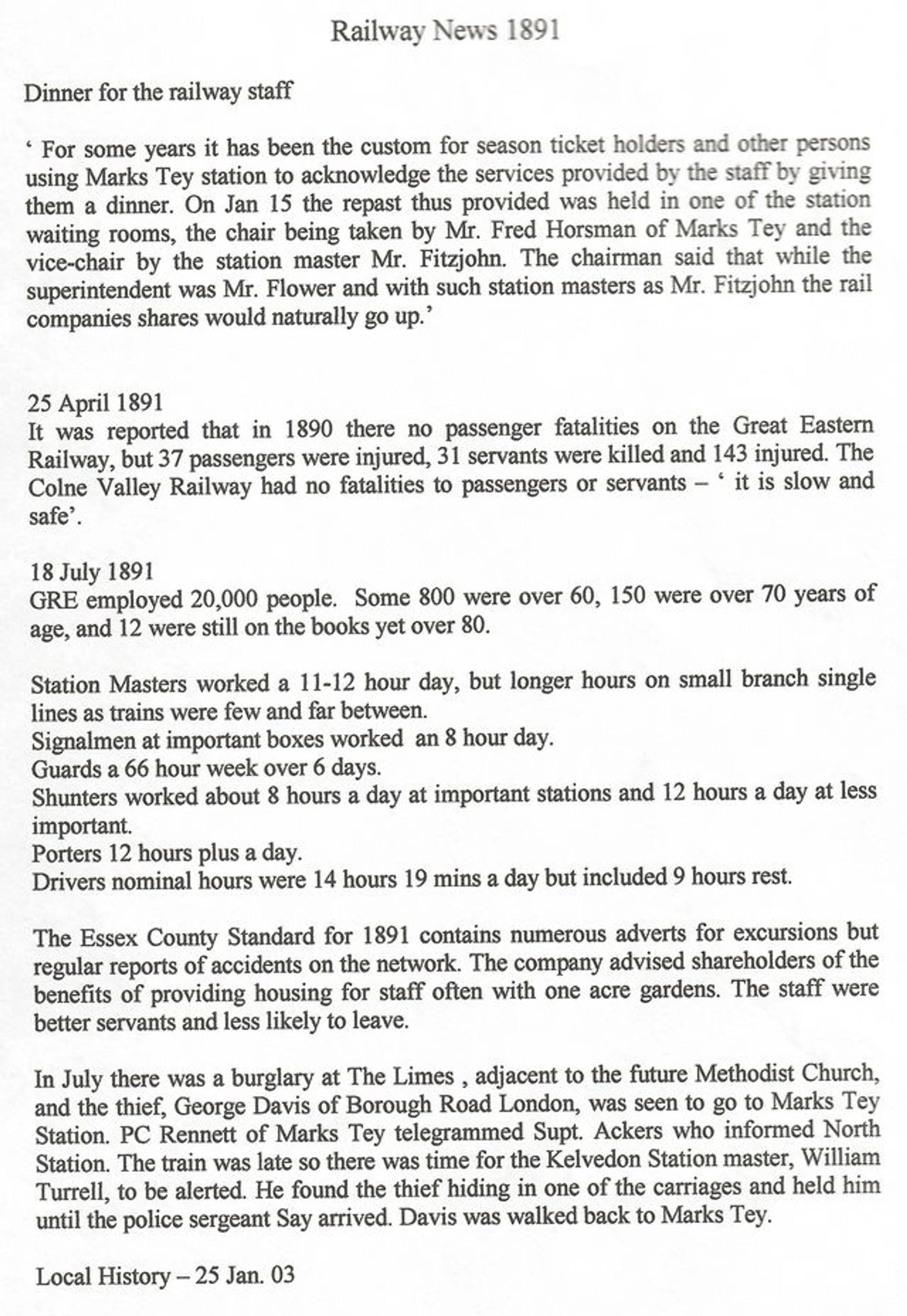 Newspaper reports regarding the railway in 1891.