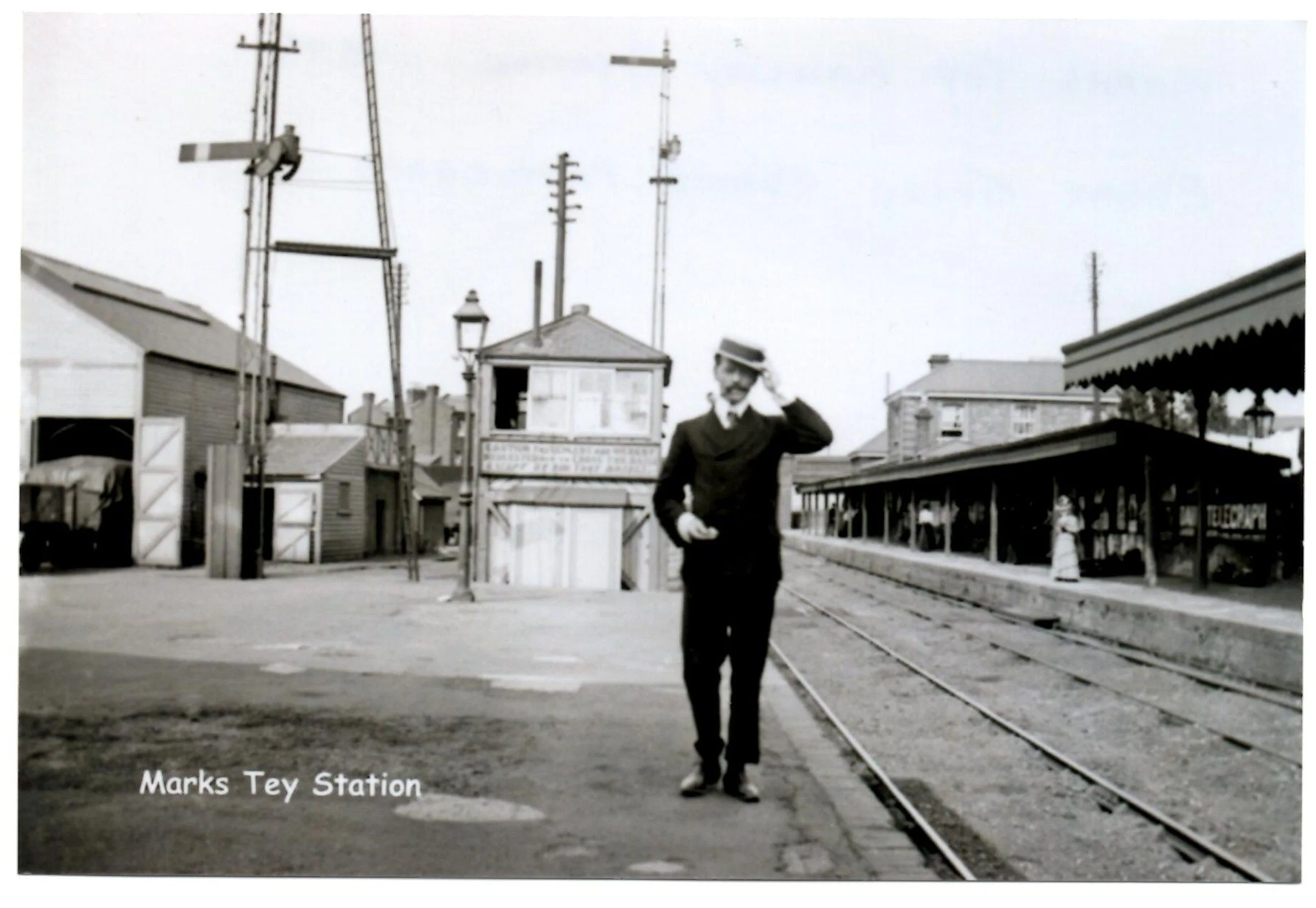 Historic photograph showing Marks Tey station and signal box, and L. Bracher photographed by Adams, 6th June 1899.