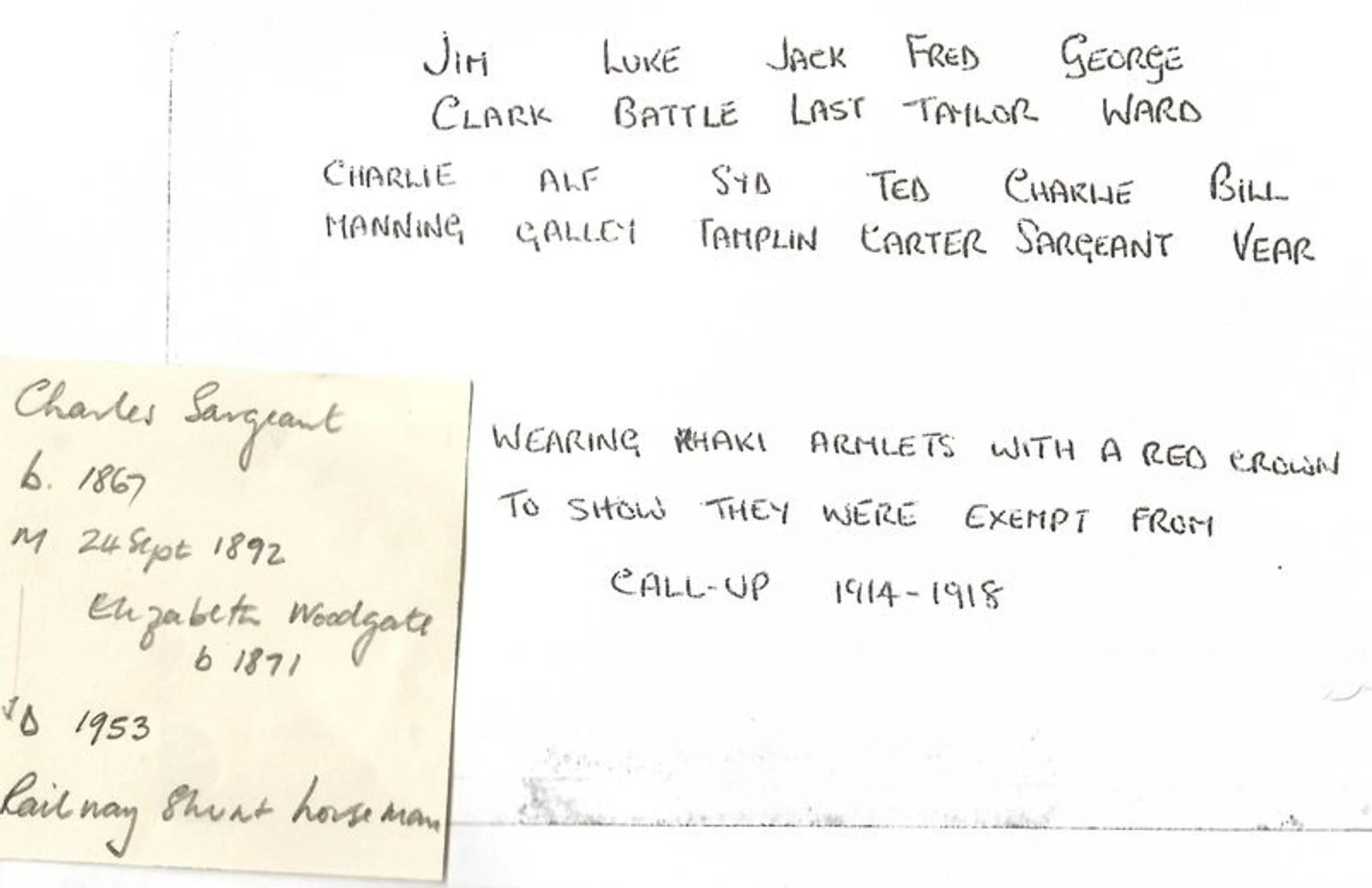 Names of the rail workers between 1914 and 1918 on the reverse of the photograph, exempt from military service.