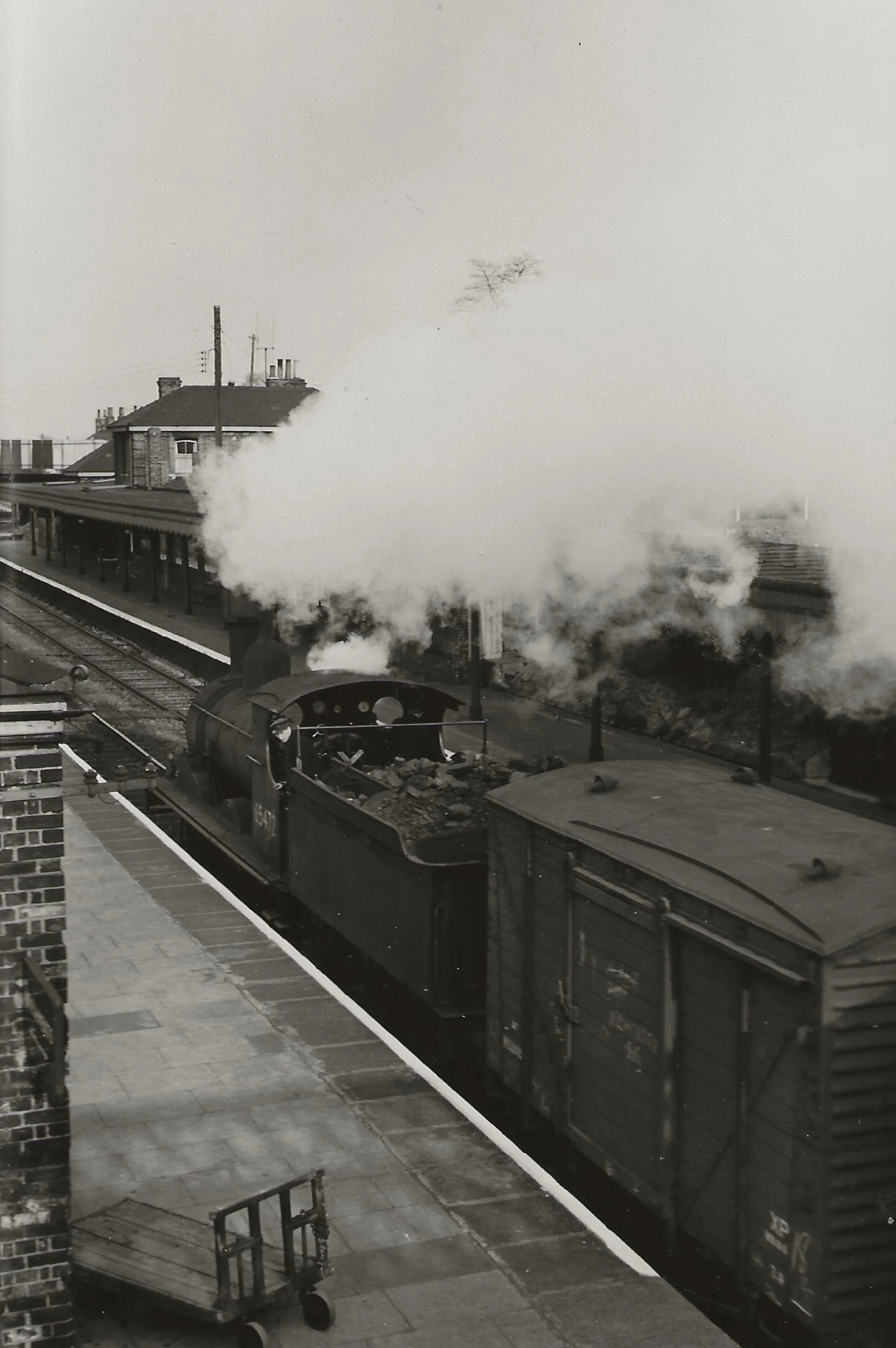 Historic photograph of a steam train on platform 2, heading towards Colchester.