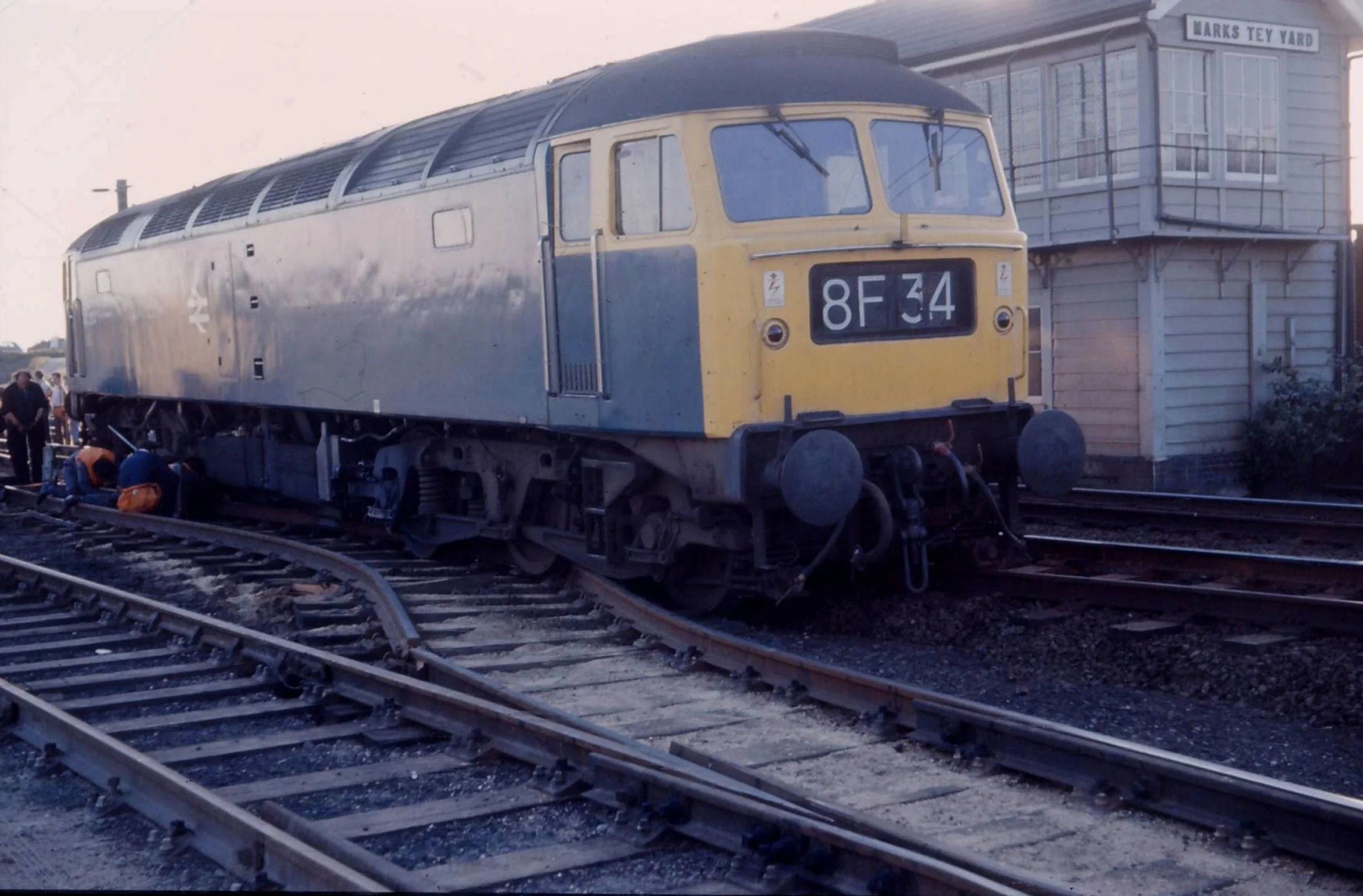 Derailed diesel locomotive 8F34, next to Marks Tey Yard signal box.