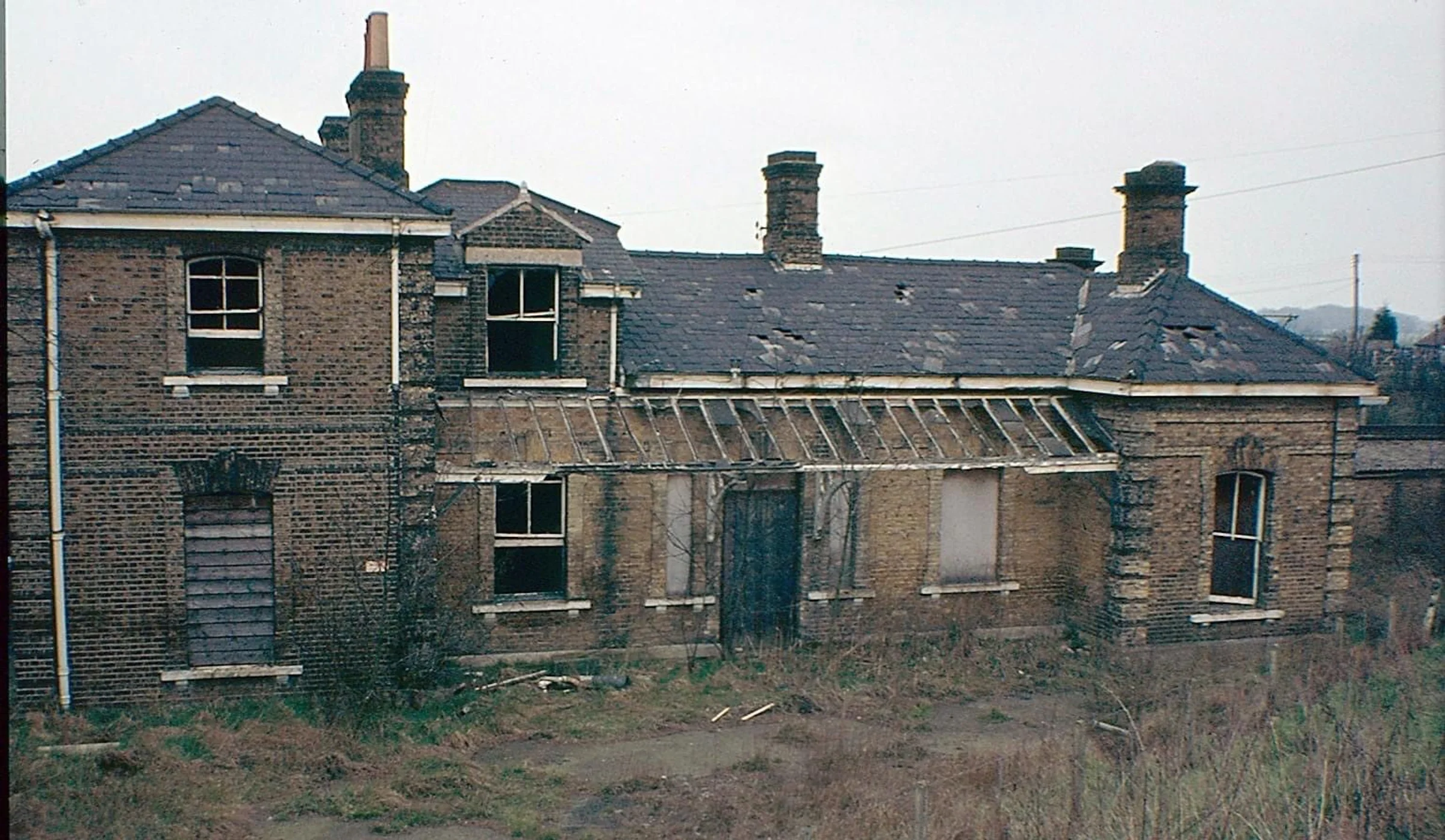 Photograph of the derelict old station building.