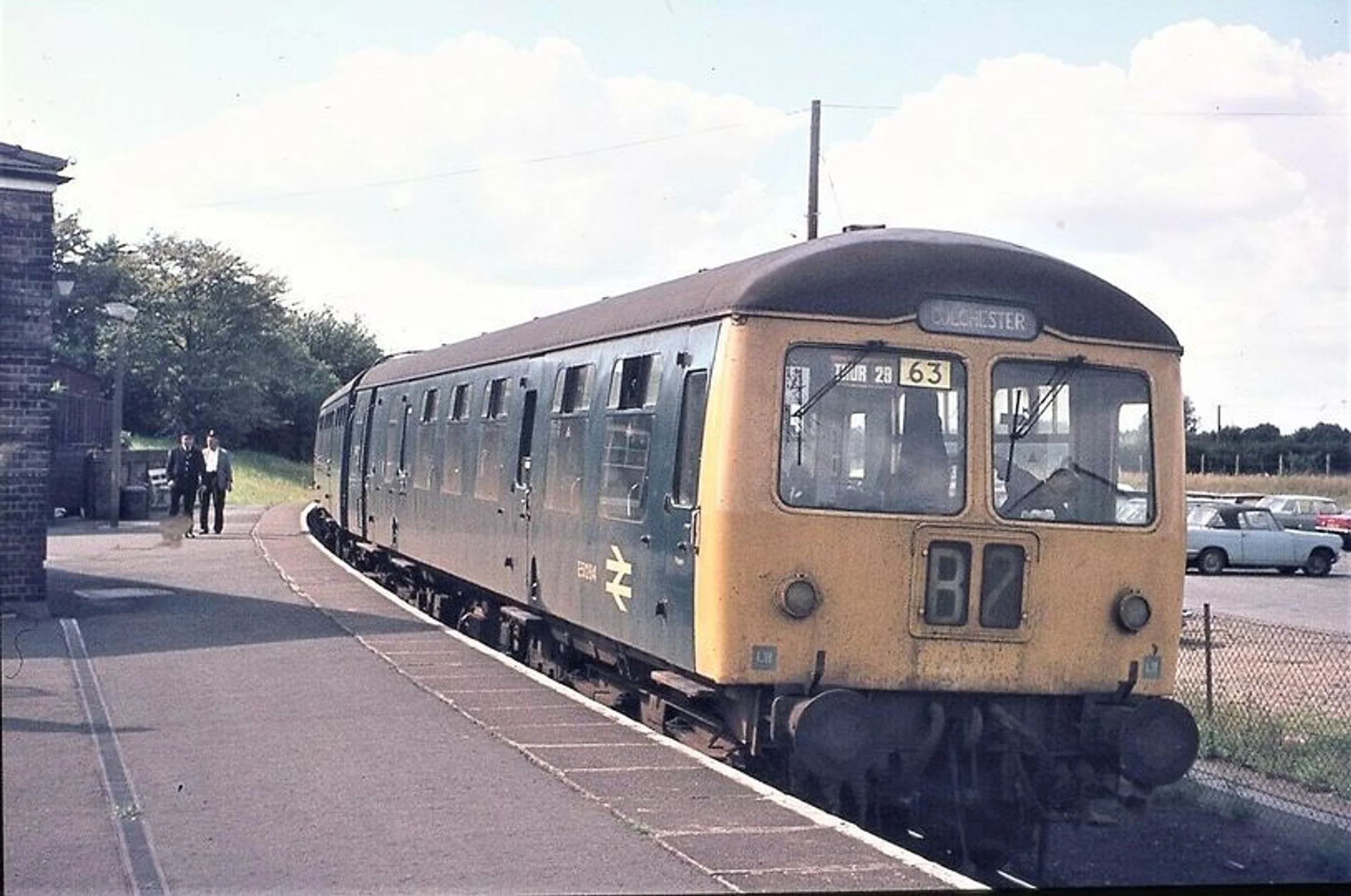 Historic photograph of a Colchester bound diesel multiple unit on platform 3, Marks Tey station.