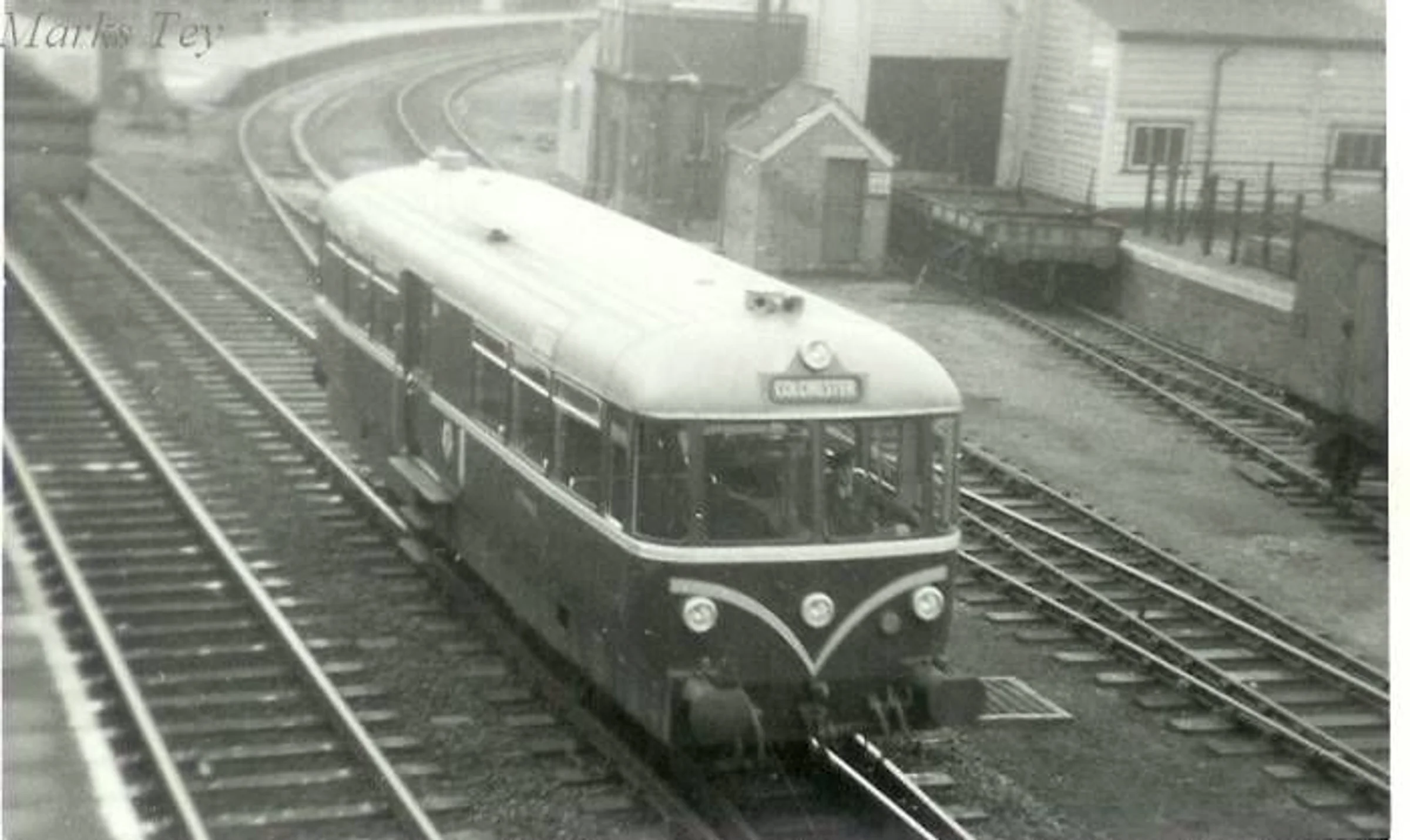 Historic photograph of a diesel unit heading towards Colchester from Marks Tey station.