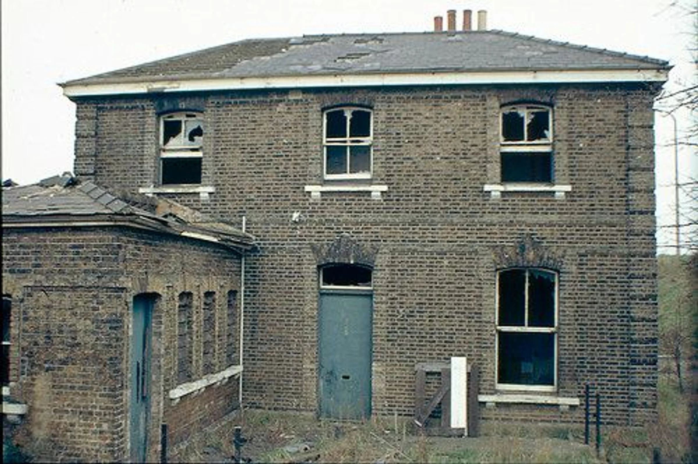 Photograph of a derelict station building.