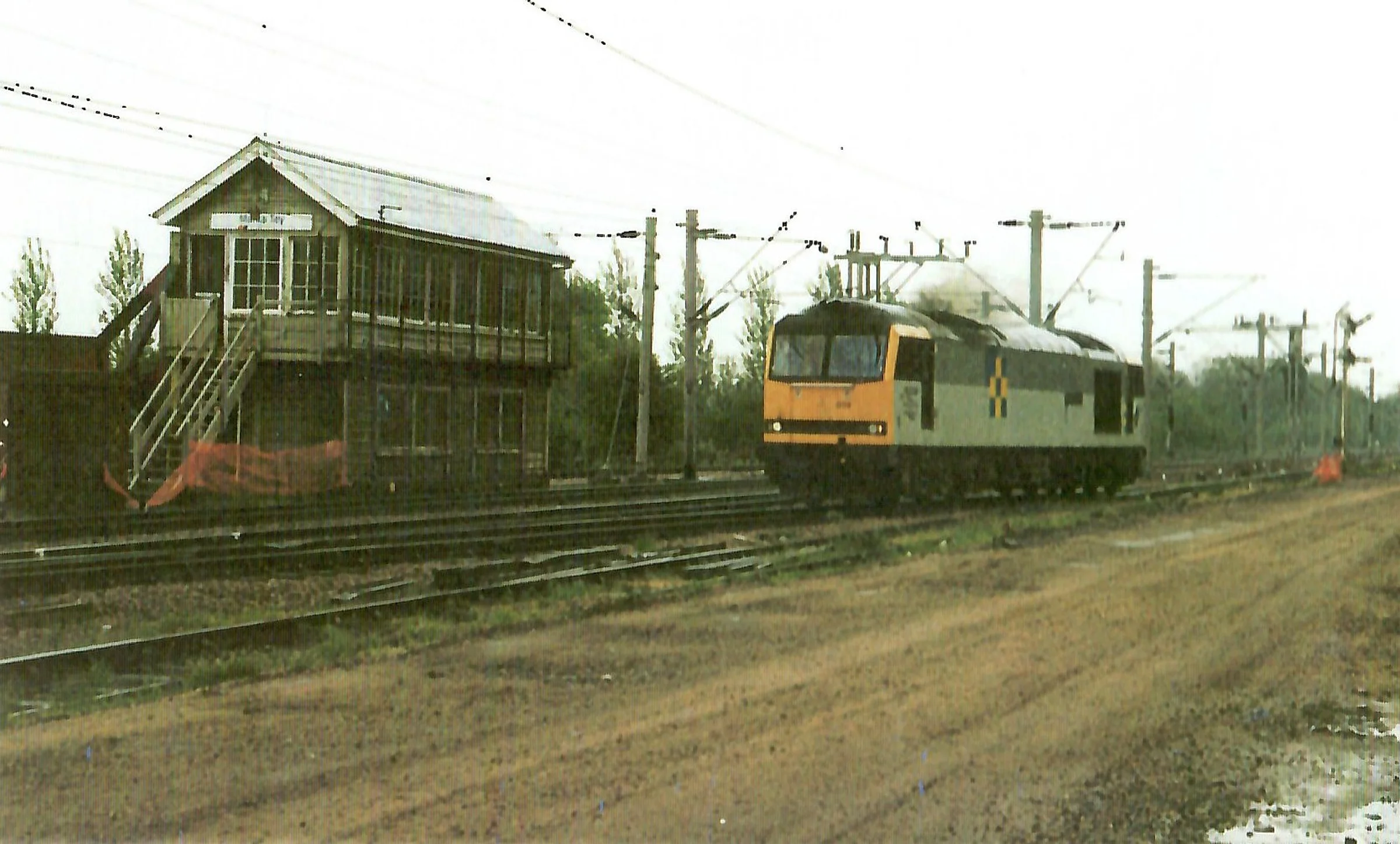 Photograph of a diesel locomotive by the signal box during engineering works at the station.