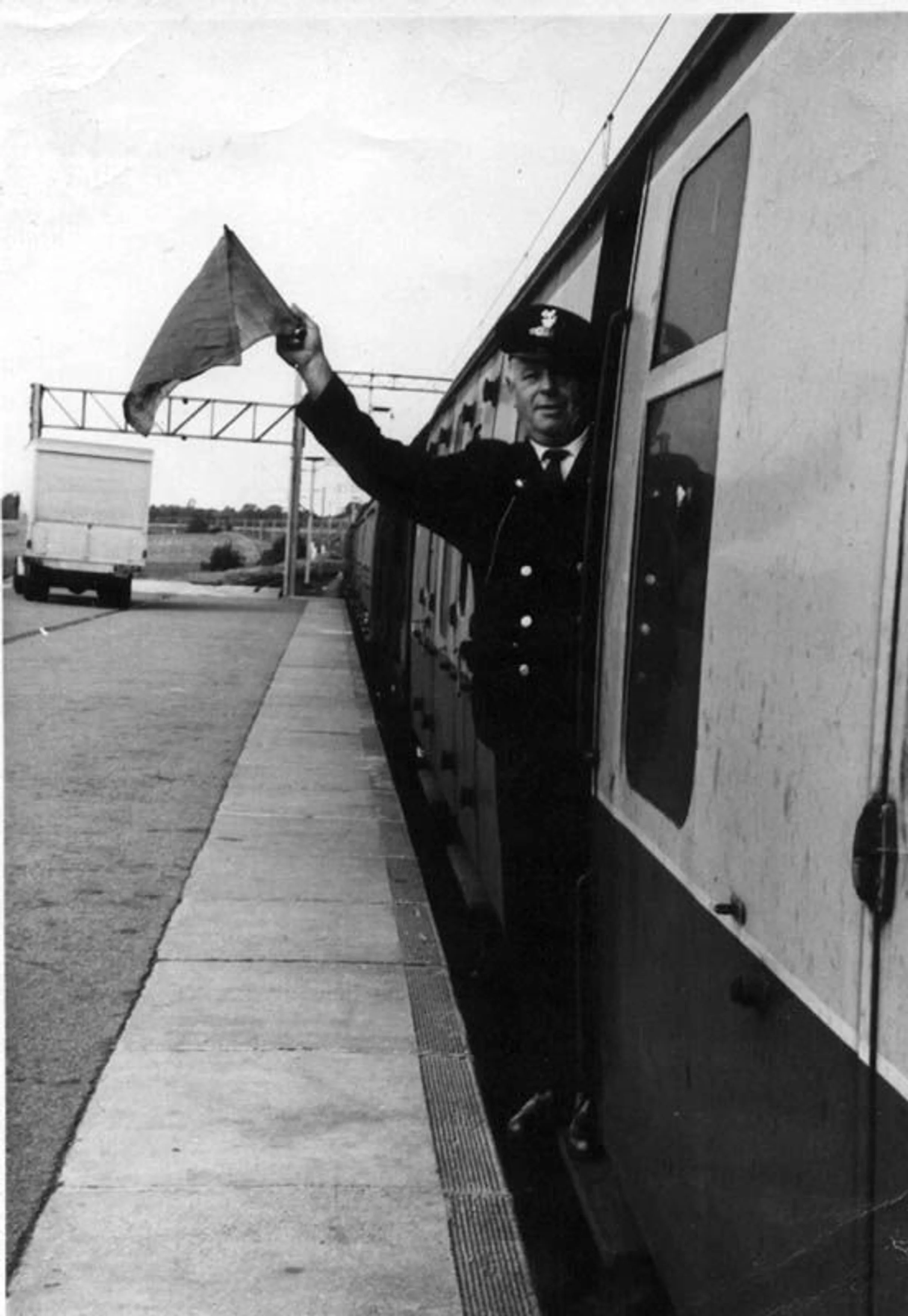 Black and white photograph of guard James Clark on board a train.
