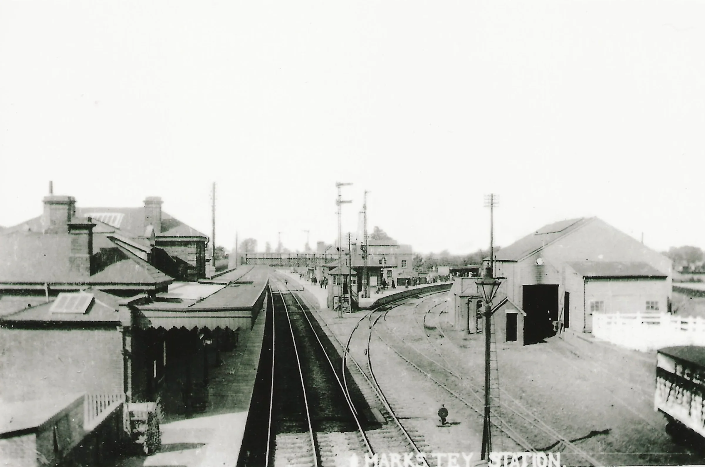 Historic postcard of Marks Tey station, looking west from North Lane bridge.