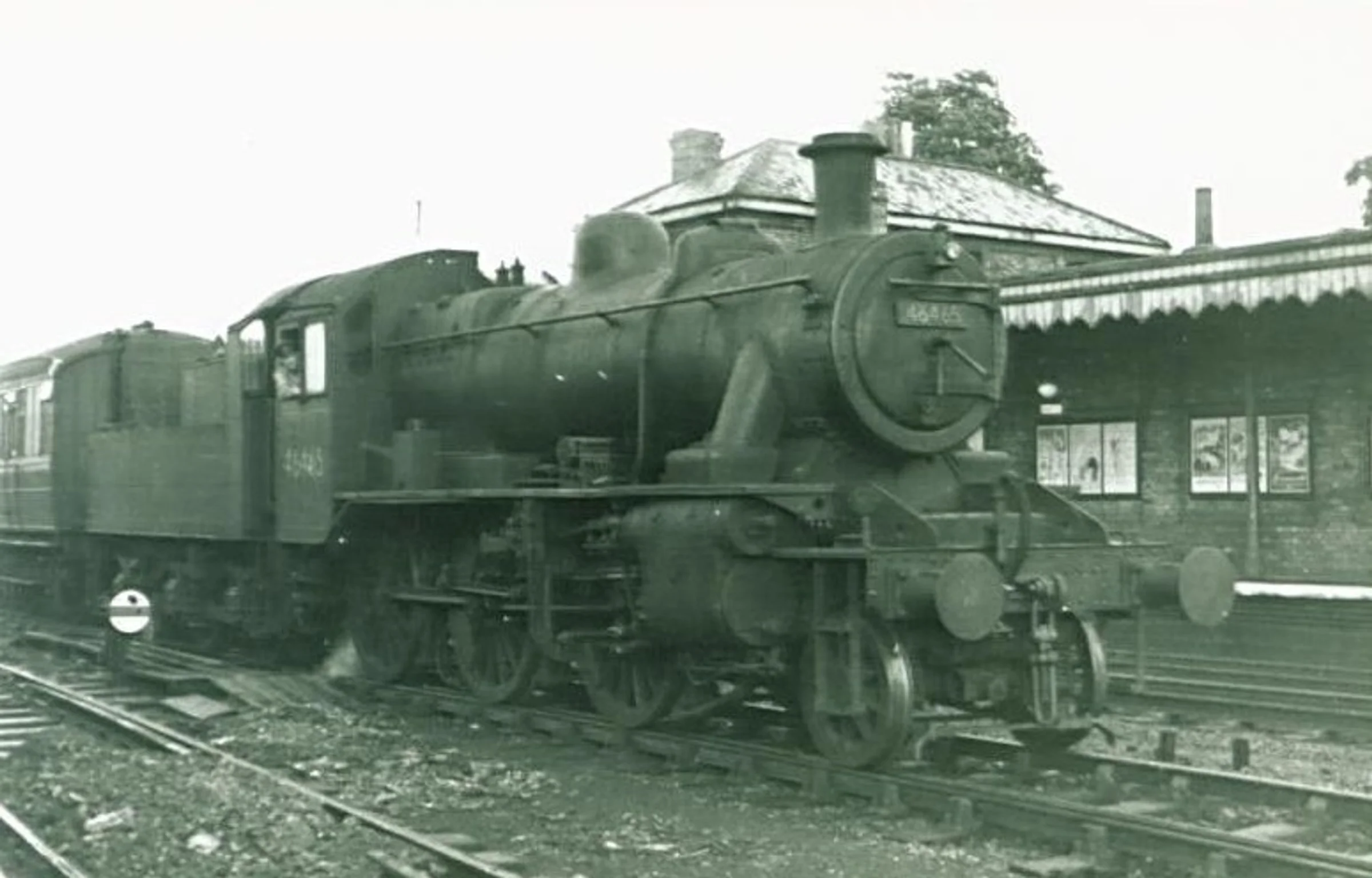 Historic photograph of steam locomotive 46465 in Marks Tey station.