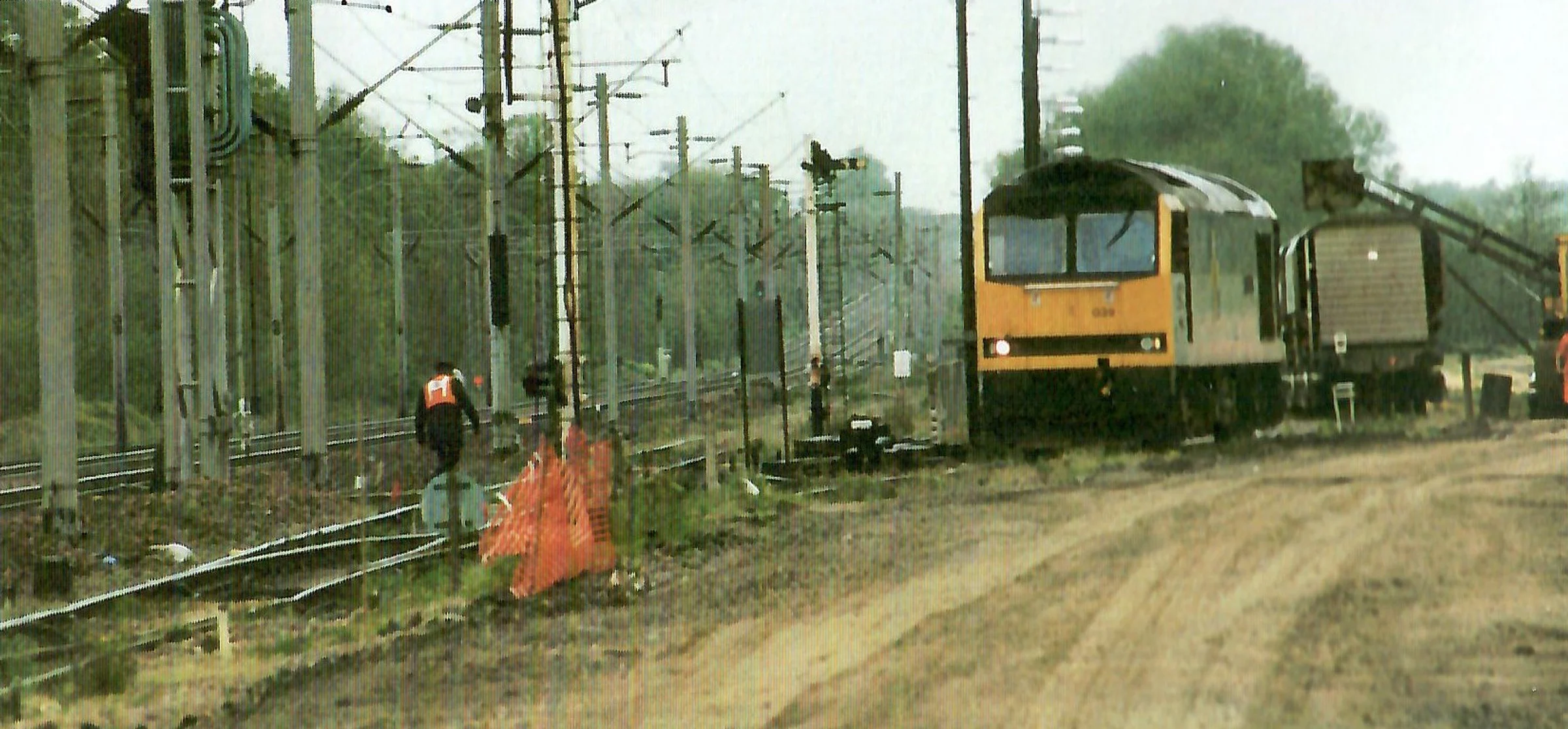 Photograph of a locomotive in a siding during engineering works.