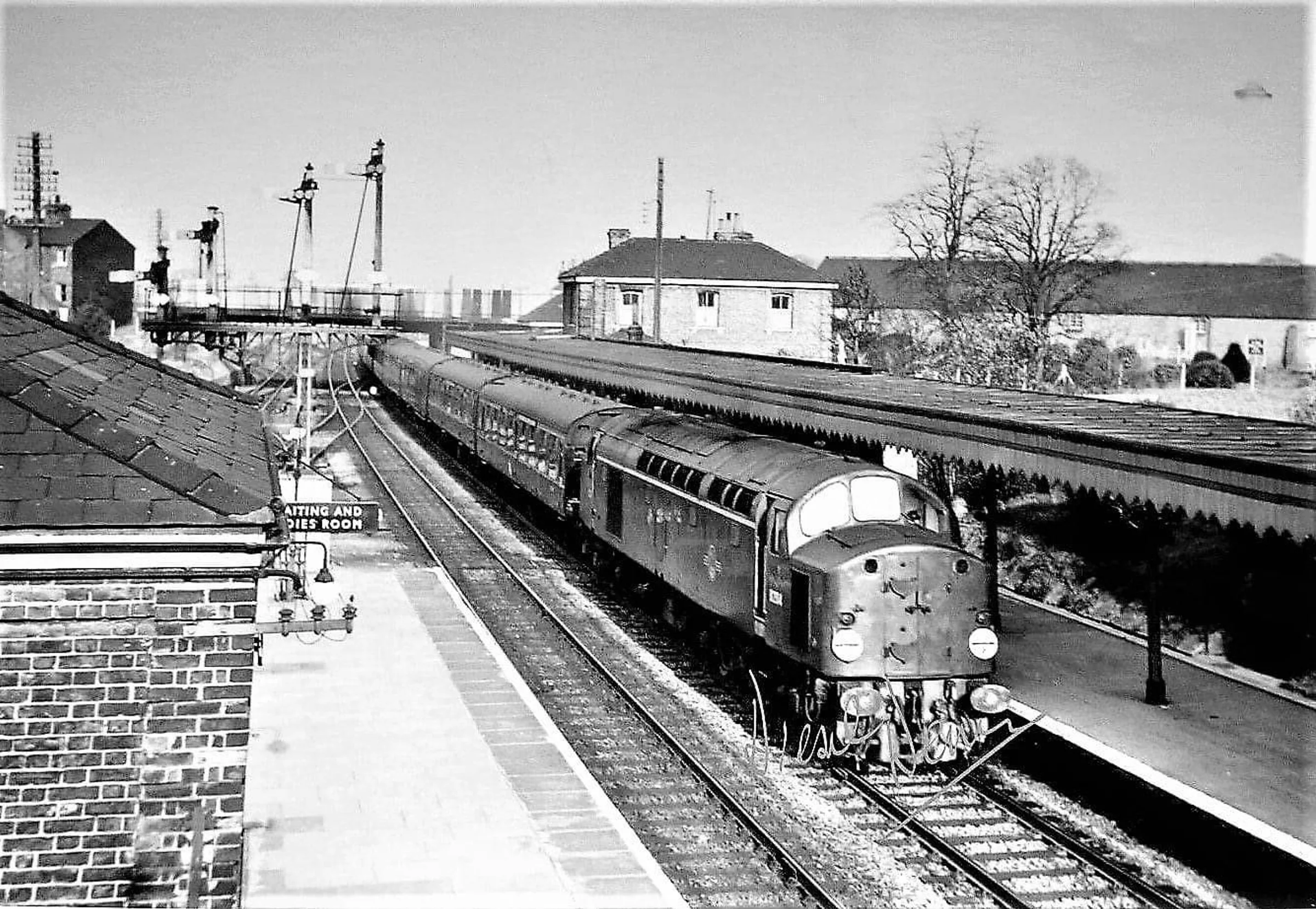 Historic photograph of a London bound diesel train on platform 1, Marks Tey station.