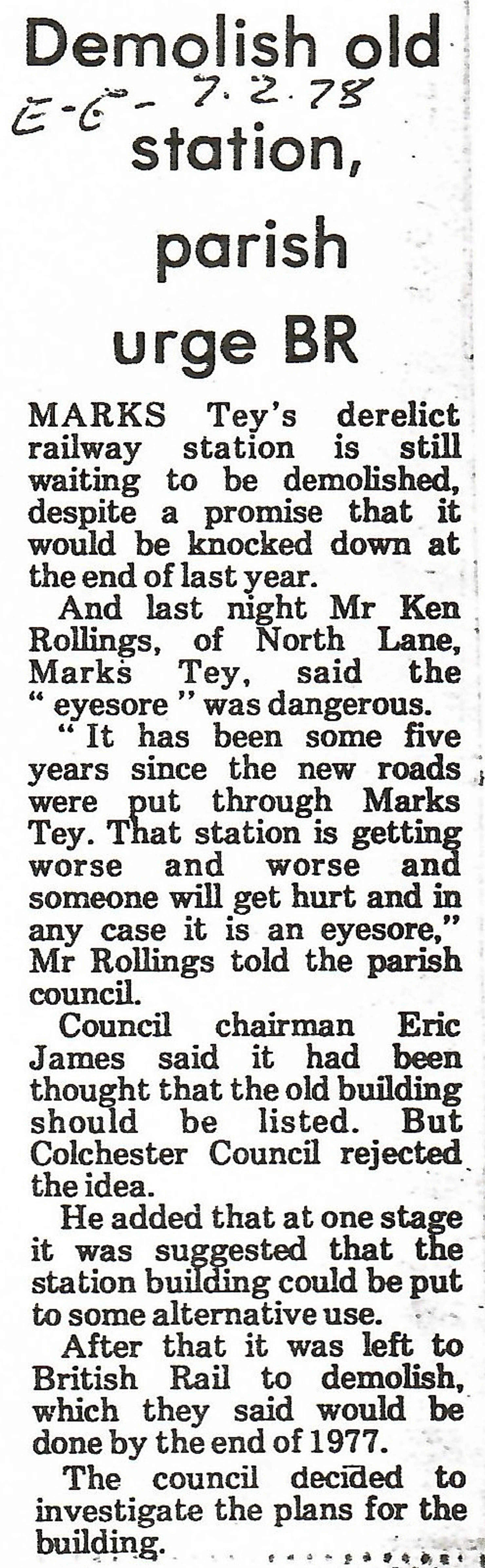 Newspaper report regarding plans for the derelict old station at Marks Tey.