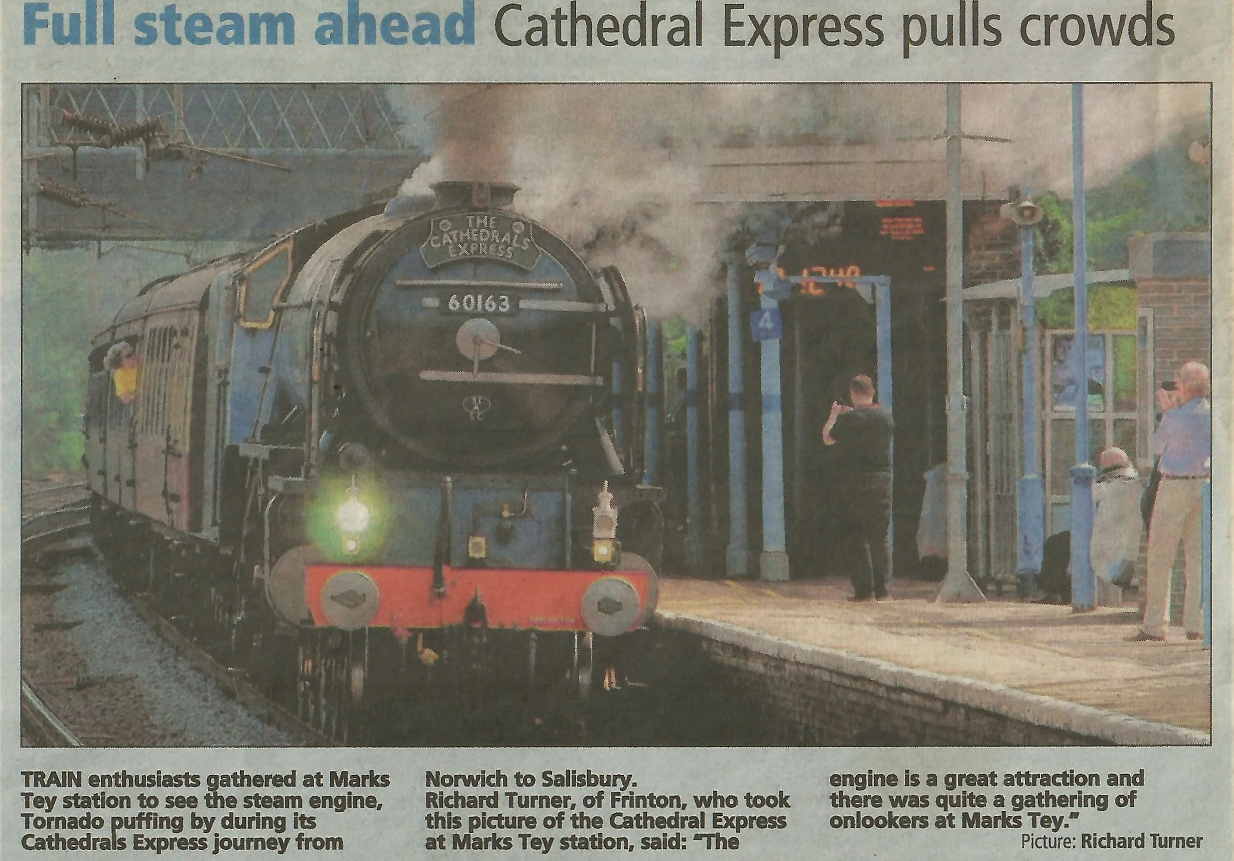 Newspaper photograph of the Cathedral Express train at Marks Tey station, pulled by the steam locomotive Tornado.