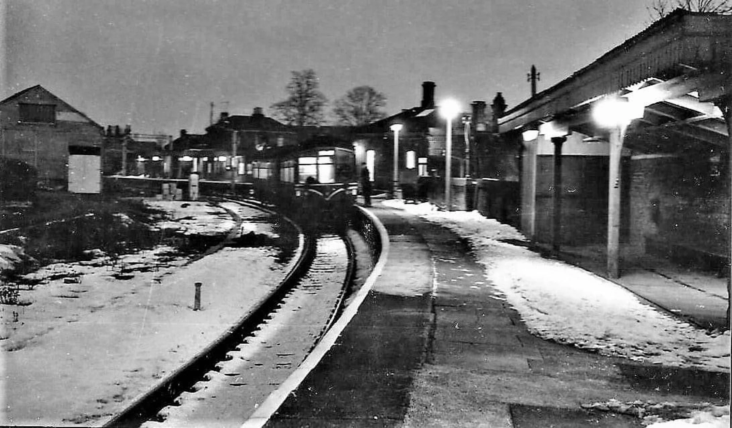 Historic photograph of snow at Marks Tey station, and a diesel multiple unit on platform 3.