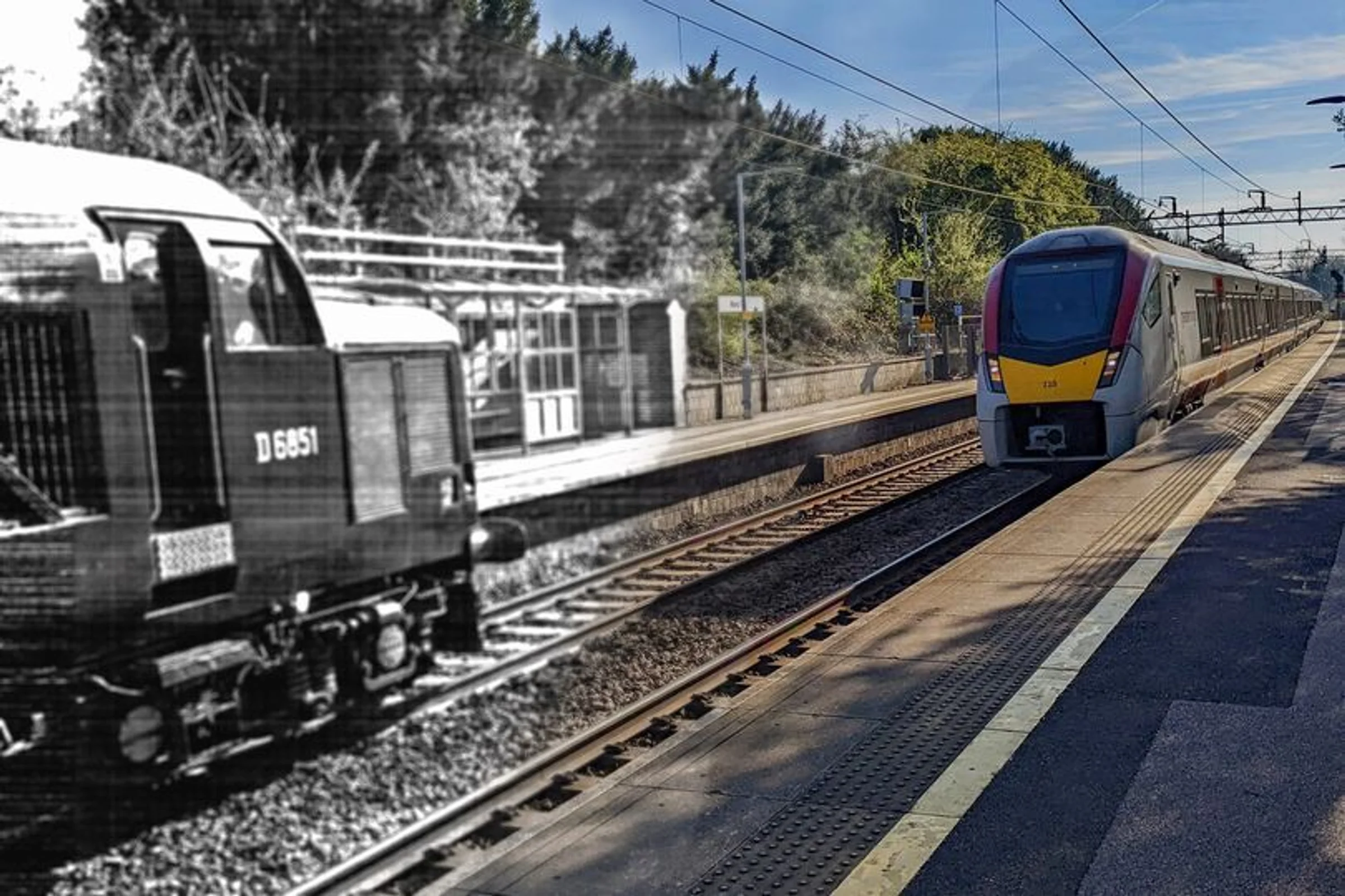 Image of the new Stadler train juxtaposed with a historic photograph of a diesel locomotive.