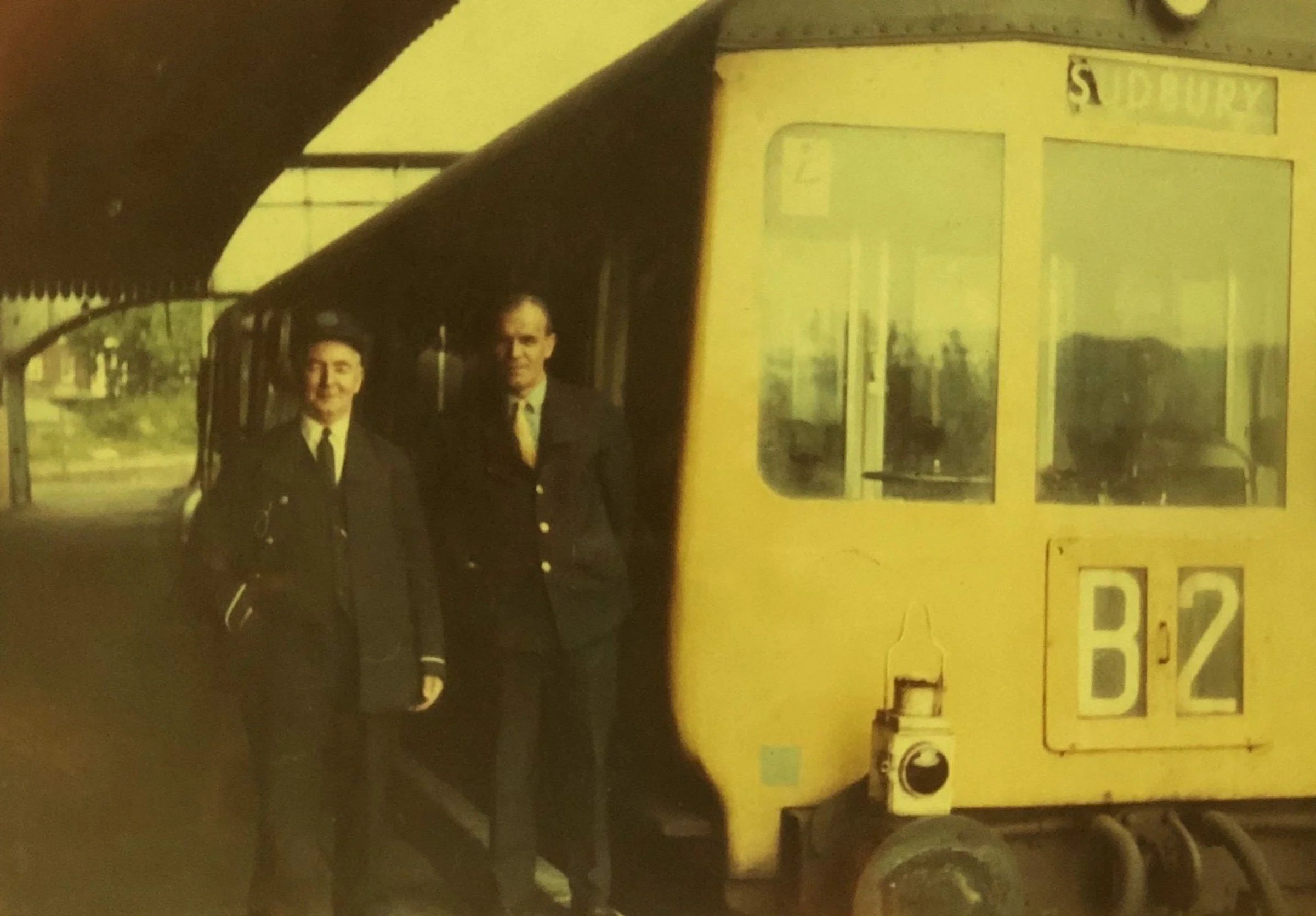 Historic photograph of Stanley Willsher and colleague next to a diesel unit on the Sudbury line, platform 3 at Marks Tey station.