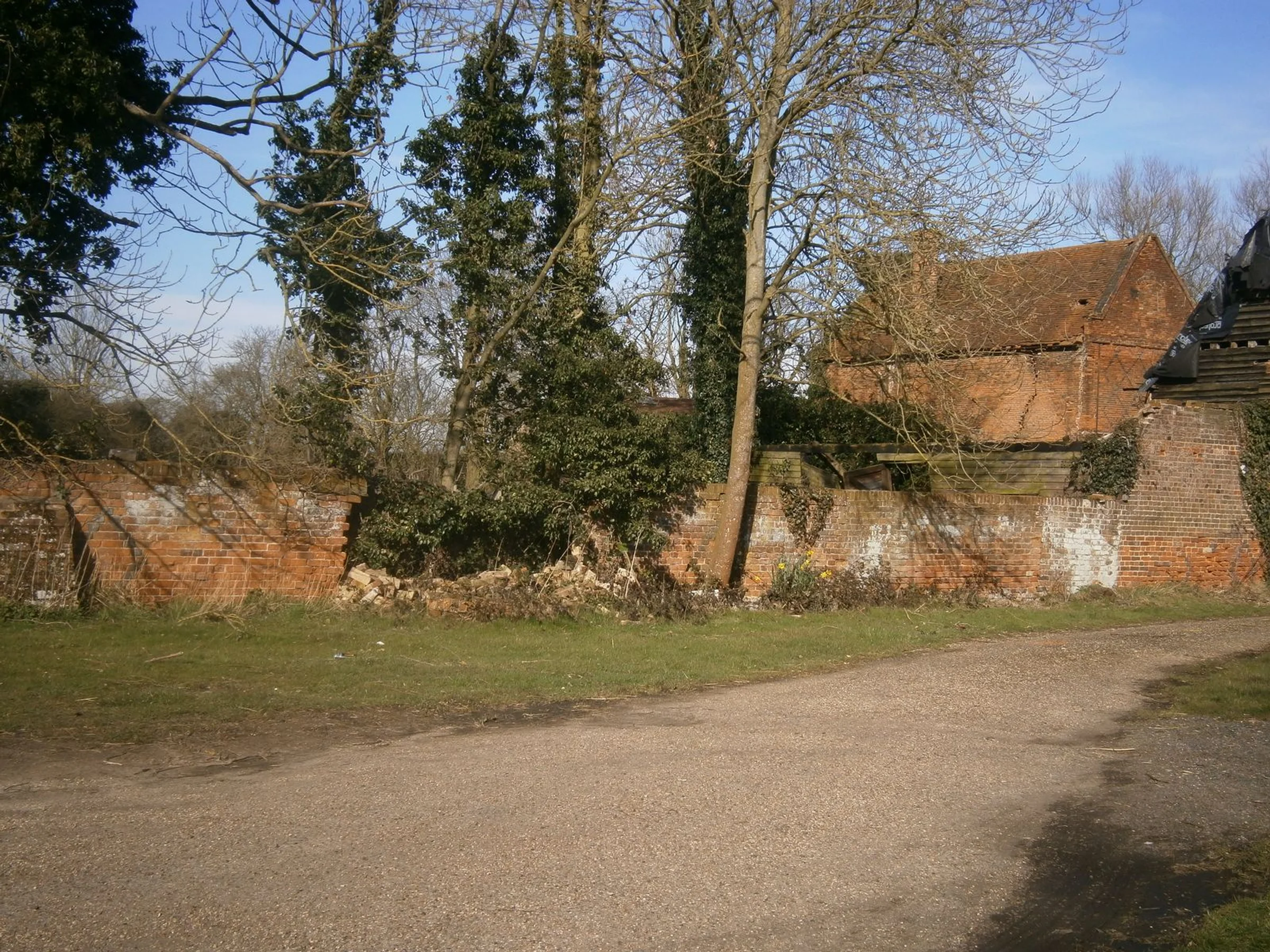 The road to the hall with a brick wall on the other side and the big brick barn beyond.