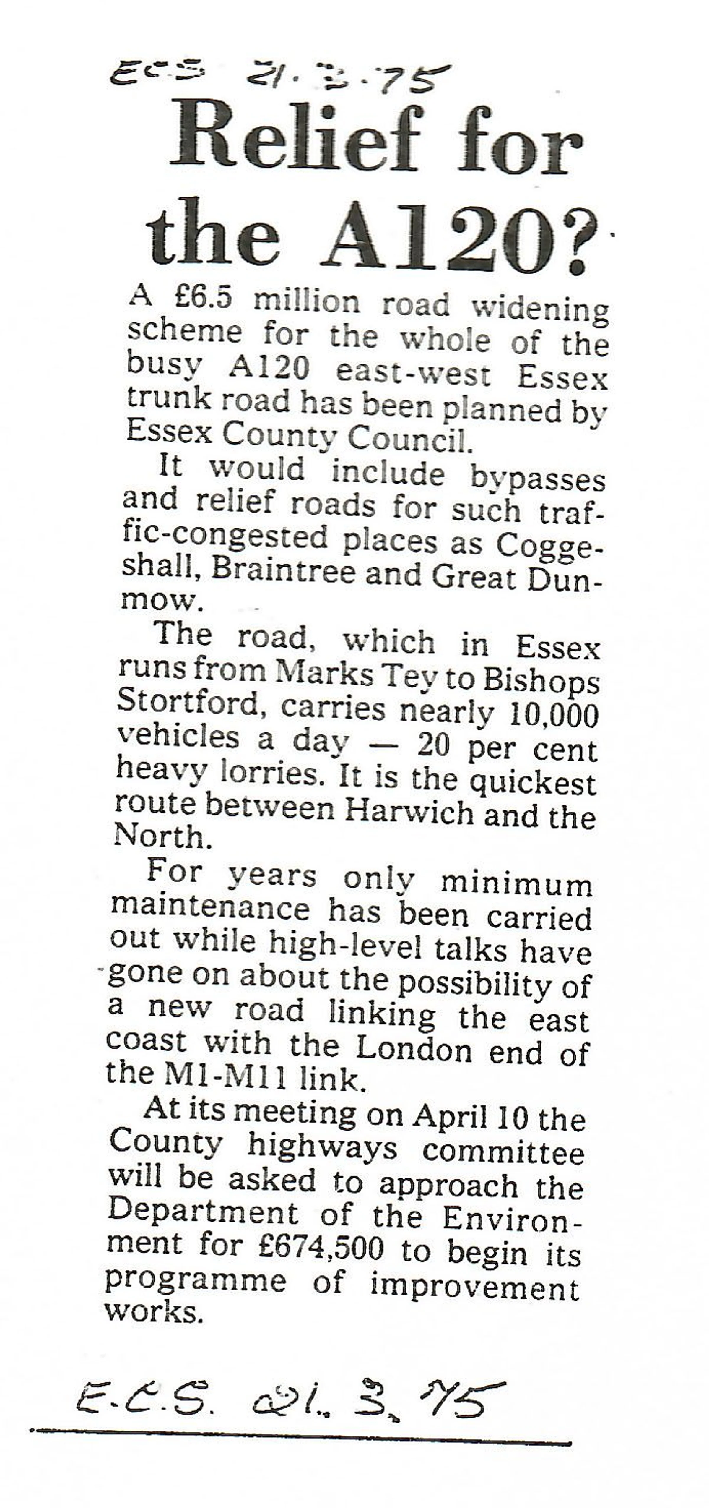 Short article detailing a road-widening scheme for the A120.