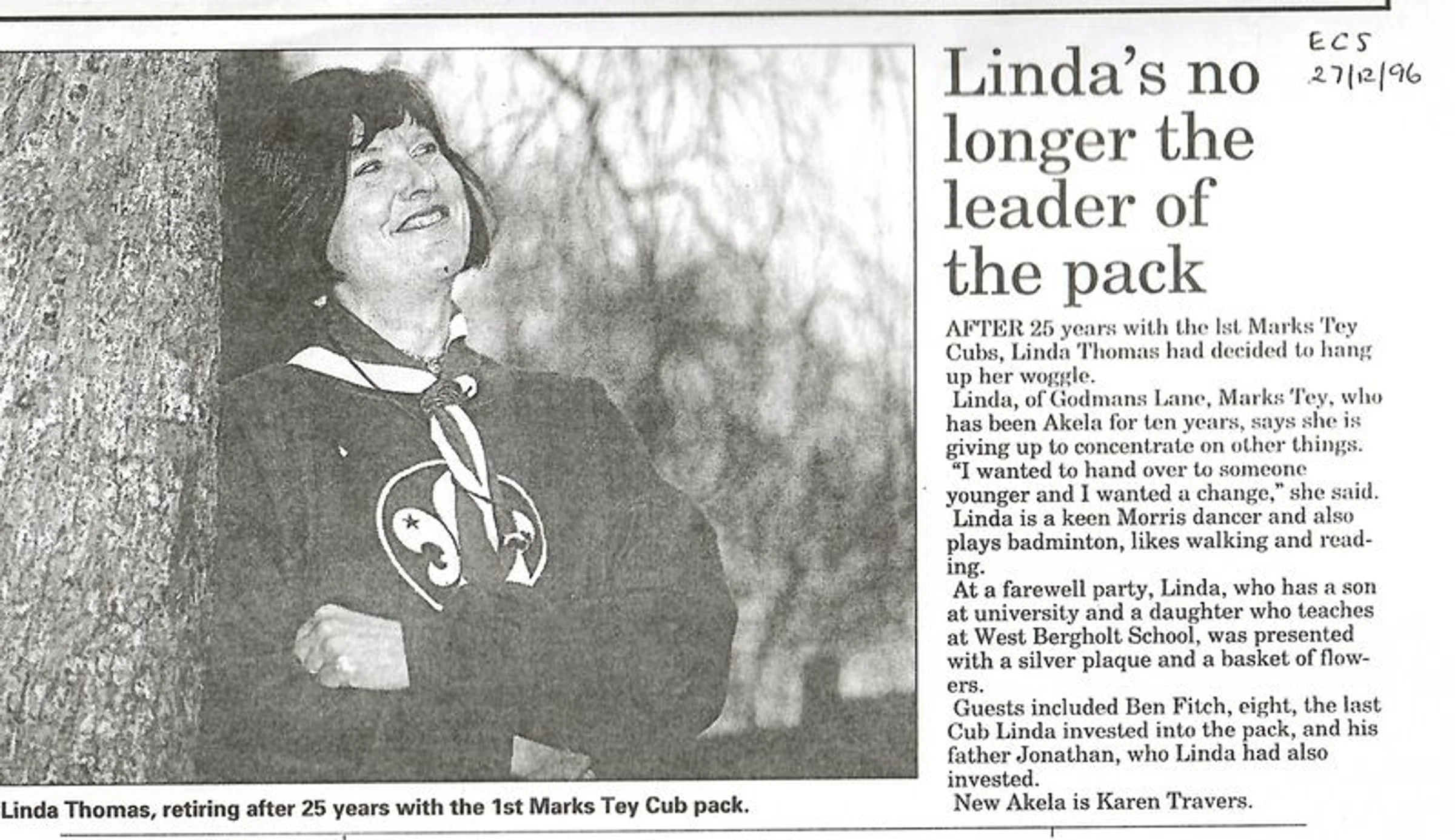 After 25 years with the 1st Marks Tey Cubs, Linda Thomas has decided to hang up her woggle. Etc.