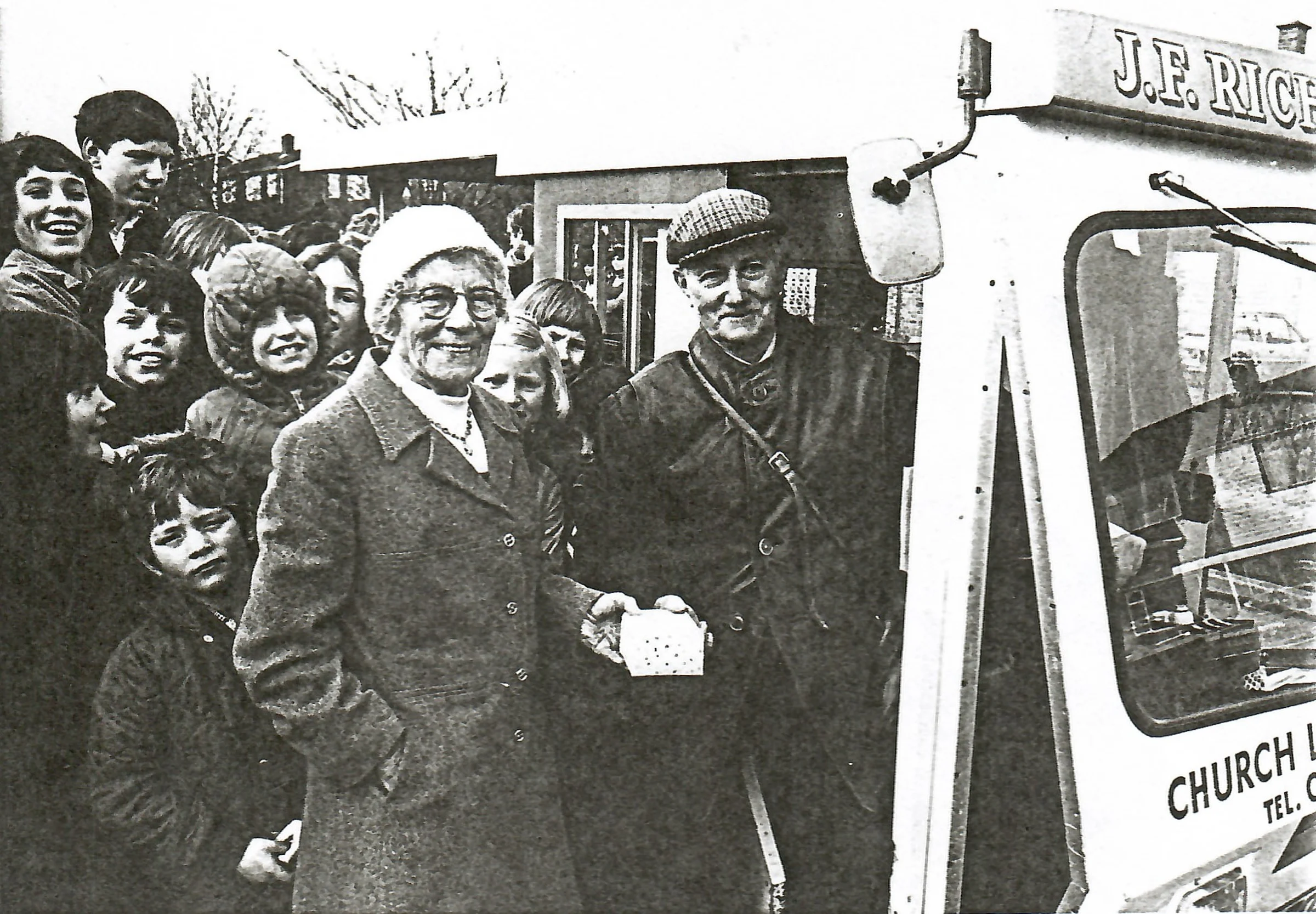 Photo of Mons Richer on his retirement surrounded by children and next to his J F Richer milk float. The date was 24 January 1981. The lady with him could be his wife, Brenda.