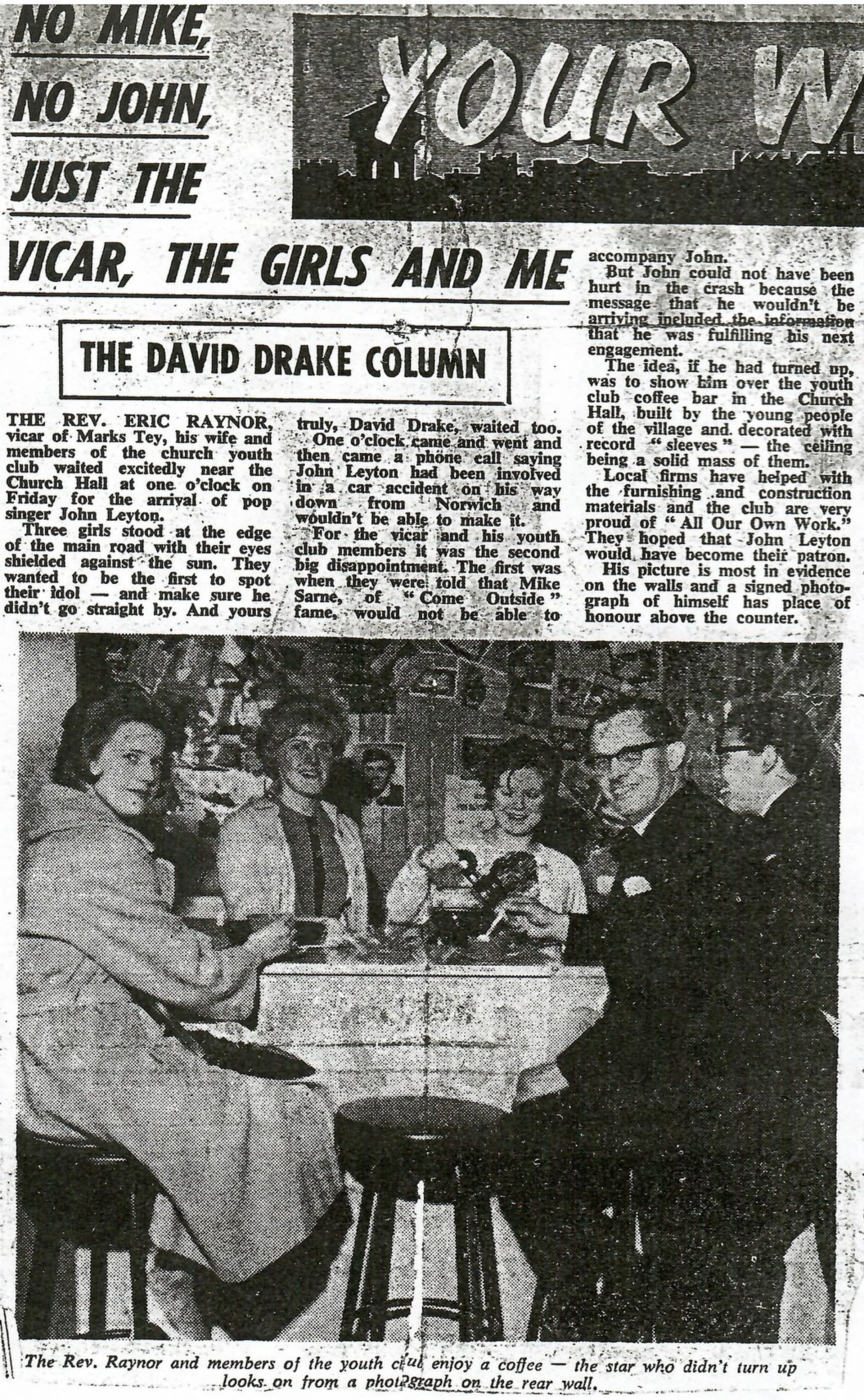 The source and date of this cutting has not been recorded but Rev Eric Raynor was among those waiting for the visit of pop star John Leyton who was expected to visit the coffee bar in the old Church Hall while passing through Marks Tey. Unfortunately he was delayed. Also in the photo are Sue Hall, Linda Wilsher and Janet Young. John Leyton to visit on another occasion.
